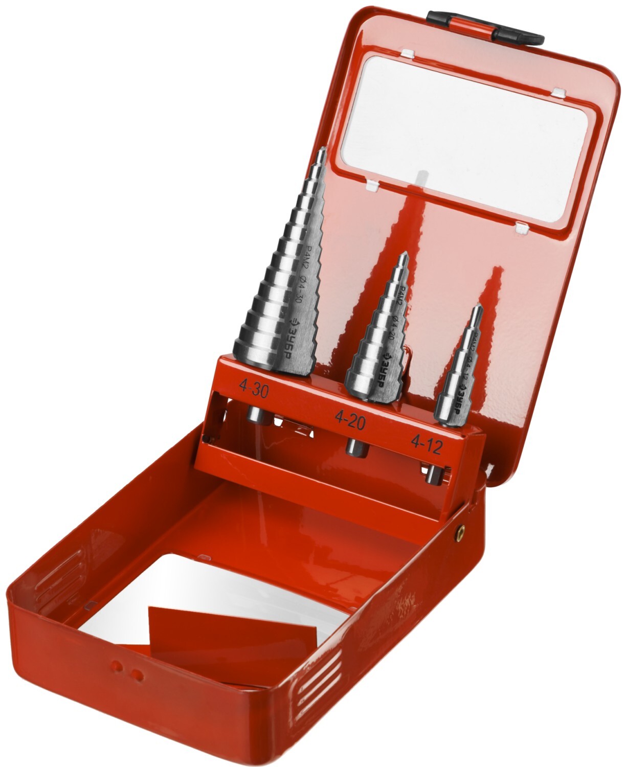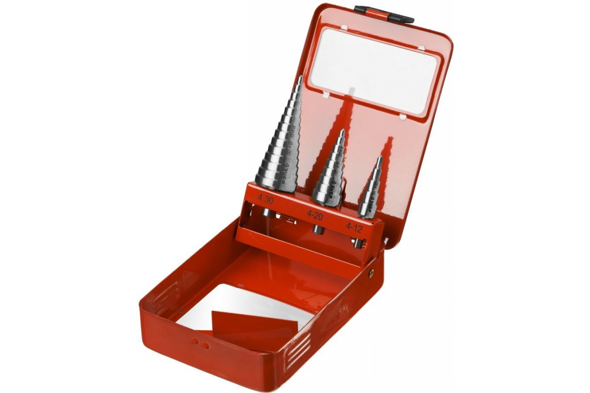 Набор ступенчатых сверл Зубр 29665-4-30-H3 предназначено для получения отверстий различного диаметра без перестановки режущего инструмента. На каждой ступени есть маркировка фактического диаметра. Сверло изготовлено из быстрорежущей инструментальной стали. Количество ступенчатых сверл в наборе — 3 шт. Поставляется в металлическом боксе.