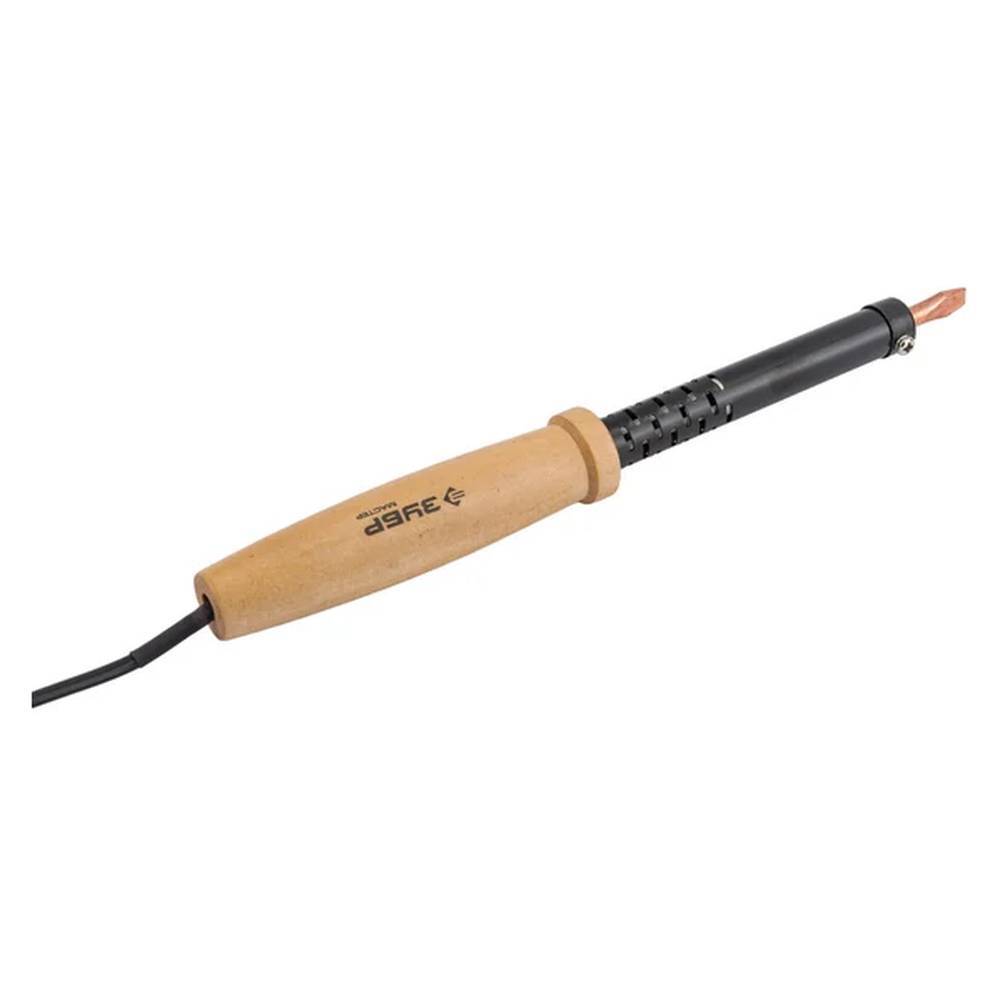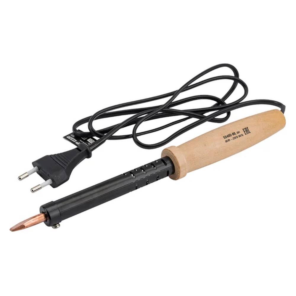Паяльник электрический 80вт оснащен деревянной рукояткой, которая обеспечивает надежный захват прибора в руке во время работы. Электропаяльник работает от сети 220 В, используется для монтажа или ремонта электронных деталей. Изготовлен из качественных материалов, что обеспечивает длительный срок эксплуатации.