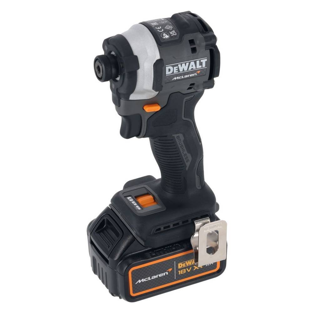 Аккумуляторная дрель-шуруповерт DeWalt McLaren Limited Edition DCF85MP2T ударная – это лимитированная серия инструментов, в том числе винтоверт DCF85M (на базе DCF805). Инструмент оформлен в стилистике McLaren под карбон, выглядит эффектно. В комплект входят два аккумуляторa McLaren Edition 18V 5 Ач и зарядное устройство. Набор поставляется в кейсе TSTAK черного цвета. Импульсный шуруповерт обладает компактными размерами, поэтому удобен для использования в ограниченных пространствах. Благодаря тангенциальному удару позволяет работать с прикипевшим крепежом. Трёхпозиционный переключатель режимов дает возможность выбрать оптимальное количество оборотов. Бесщёточный двигатель увеличивает время работы на одном цикле заряда до 50% и повышает мощность на 20% в сравнении с шуруповертами на щеточном моторе. Интеллектуальная схема защищает шуруповерт от перегрузки - он отключается.