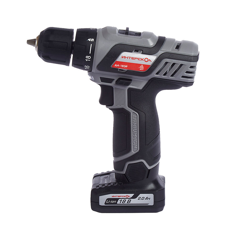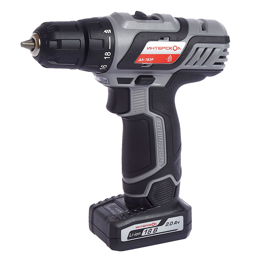 Компактный двухскоростной шуруповерт аккумуляторный ИНТЕРСКОЛ ДА-18 ЭР, оснащенный подсветкой рабочей зоны, с литий-ионовым аккумулятором для работы с крепежом, закручивания/откручивания саморезов и сверлильных работ.