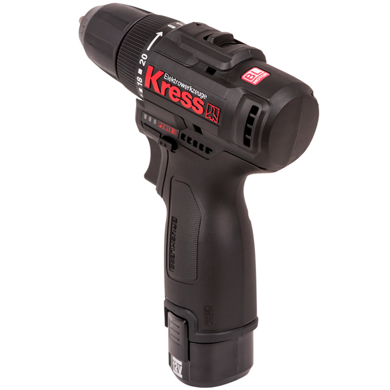 Аккумуляторная дрель-шуруповерт KRESS KU202.1 с крутящим моментом 38Нм для сверления и работ с крепежом. Имеет бесщеточный двигатель, быстрозажимной патрон 10мм b скорость до 1700 об/мин.