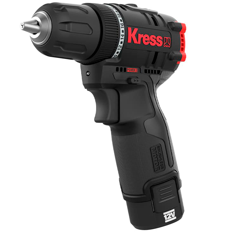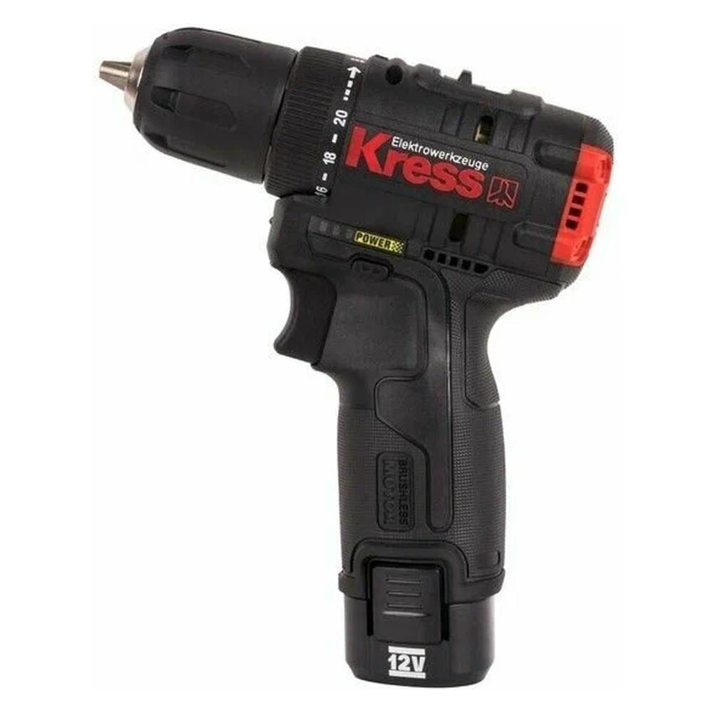 Аккумуляторная дрель-шуруповерт KRESS KUA24 для сверления и закручивания с крутящим моментом 40Нм и бесщеточным двигателем. Диаметр сверления метала составляет 10мм, древесины — 20мм.