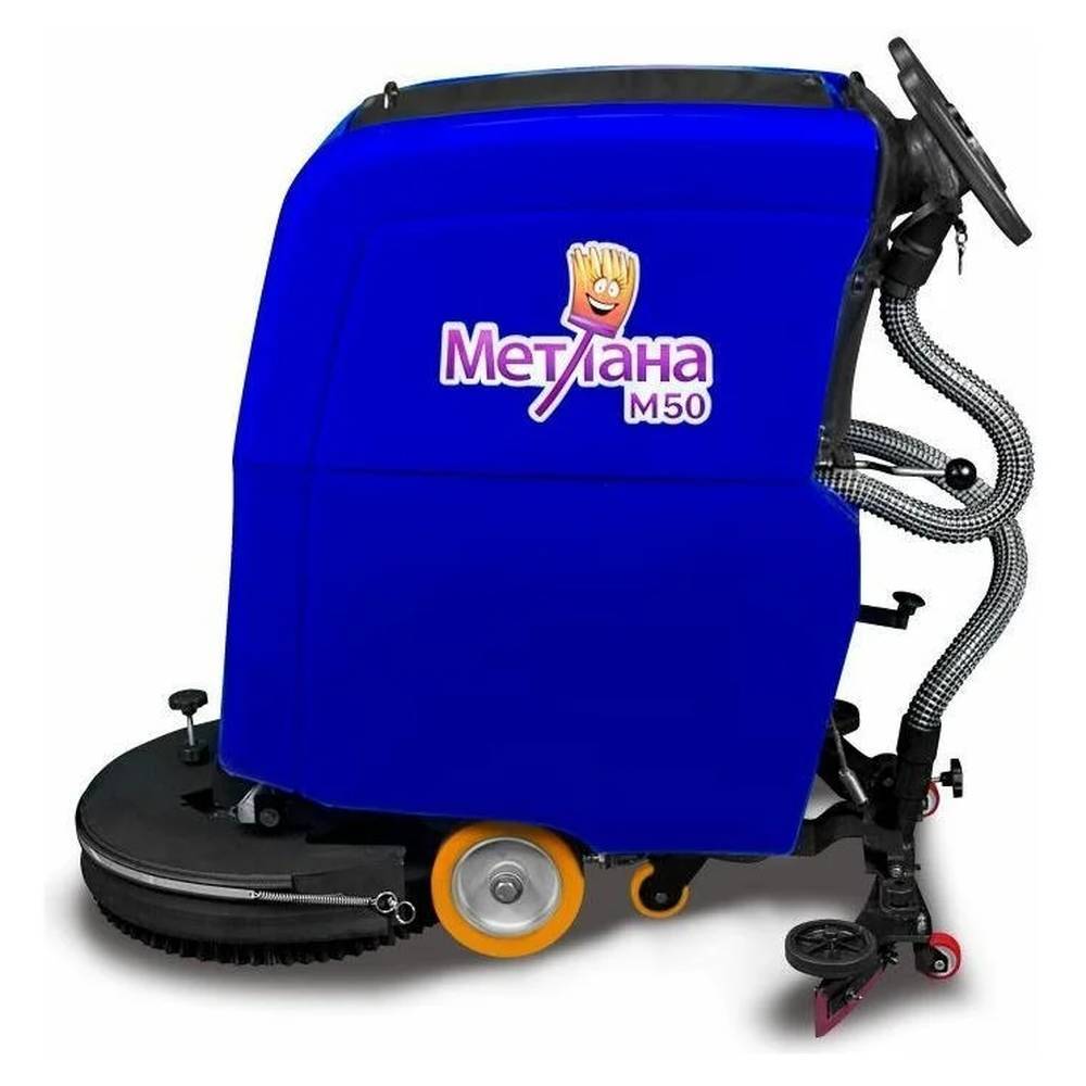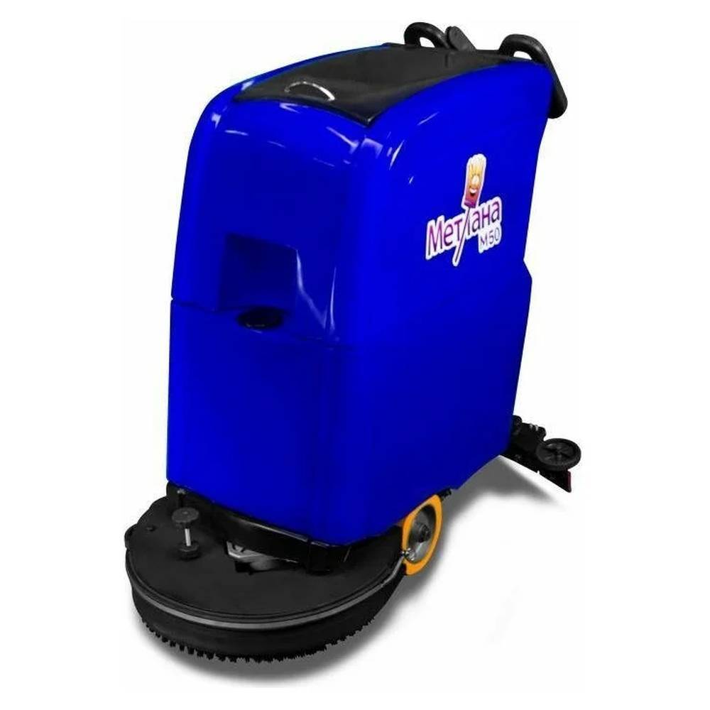 Аккумуляторная поломоечная машина "Метлана M50B" с баками 40/50 л, шириной захвата 51см и продолжительностью автономной работы более 2,5 часов. Продолжительность автономной работы определялась с новыми, полностью заряженными AGM аккумуляторными батареями ёмкостью 76Ah/5HR, путем многократного испытания машины на стенде с полной нагрузкой (с включенными мотором щетки и вакуумным мотором) без перерыва до отключения питания датчиком разряда батареи. Фактическое время работы машины на объекте может быть значительно больше, так как в реальных условиях машина не работает непрерывно с полной нагрузкой. Требуются перерывы на слив/залив воды, перемещение к месту замены воды и т.п. Машина безупречно справляется с задачами по уборке площадей до 4500 квадратных метров, надежна и проста в обслуживании. Спроектирована, создана и серийно выпускается в России.