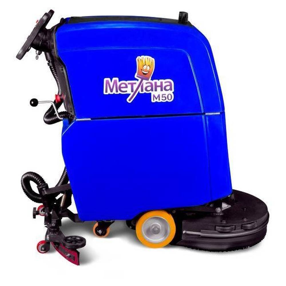 Аккумуляторная самоходная поломоечная машина МЕТЛАНА М50ВТ синяя - поломоечная аккумуляторная машина с приводом хода (самоходная). Машина рассчитана для механизированной влажной уборки напольных покрытий. Стальная рама и ударопрочный пластик обеспечивают долгий срок службы машины. Предназначена для уборки средних площадей.