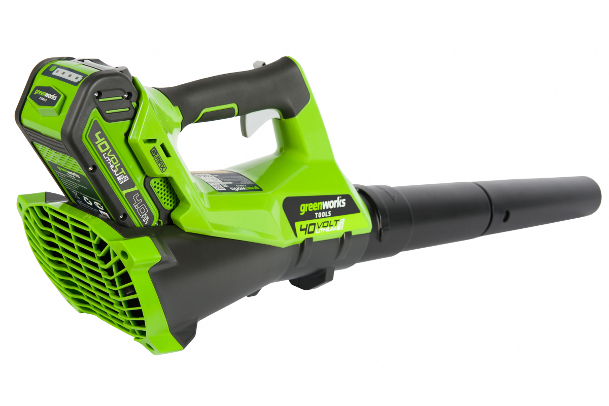 Воздуходув работает от аккумуляторной батареи G-MAX 40V, которую можно использовать с другими устройствами из линейки устройств GreenWorks 40V.