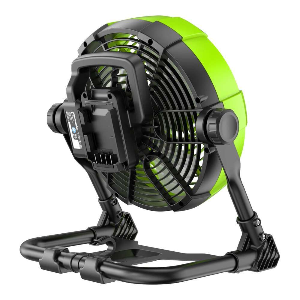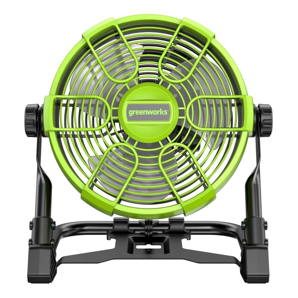 Аккумуляторный вентилятор Greenworks G24FAN (без акк,без з/у) спасет в жару и духоту на отдыхе или на работе. Имеет гибридное питание: от аккумуляторной батареи 24V и от сети 110-240V. Производительность достигает 14,2 м³/мин, которая обеспечивается тремя лопастями, изготовленными из прочного полимерного пластика. Устройство имеет 5 режимов, которые регулируются одной кнопкой. Модель обладает защитным кожухом из прочного полимера. Наклон регулируется в вертикальной плоскости 360°. Вентилятор устойчив в любом режиме работы, благодаря металлической раме корпуса. Для удобной транспортировки предусмотрена рукоятка. Также есть встроенная в раме проушина для крепления на стену и S-образный крюк для подвеса. Вентилятор работает от аккумуляторной батареи 24V, совместимой со всеми устройствами Greenworks 24V. Аккумулятор и зарядное устройство в комплект не входят.