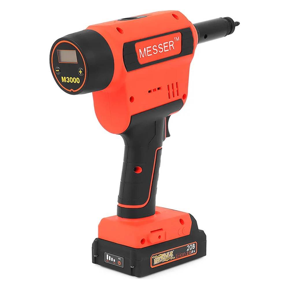 Аккумуляторный заклепочник MESSER M3000 (05-32-300) позволяет устанавливать резьбовые заклепки размерами от М3 до М10. Особенностью данного заклепочника является возможность с помощью электронного интерфейса настроить уровень сжатия заклепки с точностью до 0.1 мм. Это позволяет точно и надежно устанавливать резьбовые заклепки в материалах разной толщины. С помощью электронного дисплея можно контролировать общее количество установленных заклепок, а также заклепок установленных за смену. Для накручивания заклепки на рабочий стержень заклепочника достаточно коснуться края стержня. Заклепочник включит двигатель и самостоятельно накрутит заклепку.