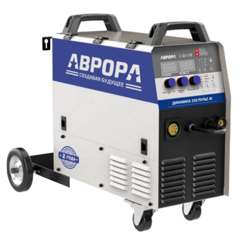 Аппарат сварочный инверторный Aurora Динамика 250 ПУЛЬС Al полуавтомат - «умный» инвертор с полностью цифровым управлением на базе ARM платформы 32бит 72МГц. Однофазный источник сварочного тока предназначен для полуавтоматической MIG-MAG сварки, для ручной дуговой сварки штучным электродом MMA, а также для аргонодуговой сварки в режиме LIFT TIG DC. Аппарат выполнен в едином корпусе со встроенным подающим механизмом, рассчитанным для использования катушек D200 и D300 (5-20кг). Тележка с подставкой под баллон и высокая компоновка аппарата существенно облегчают работу сварщика. Аппарат ориентирован на грузовые и легковые автосервисы, небольшие производства и мастерские, которым приходится решать сложные сварочные задачи, в условиях ограничений возможностей подключения только к однофазным сетям питания. Важной особенностью аппарата можно назвать высокую производительность. Ток длительной нагрузки источника при +40С составляет 180А. Это значит, что при данной температуре и значении рабочего тока аппарат не перегреется и не уйдёт в защиту даже при длительной непрерывной работе. Аппарат сварочный инверторный Aurora Динамика 250 ПУЛЬС Al полуавтомат может быть настроен сварщиком для работы в ручном или синергетическом режиме управления. Честные характеристики аппаратов АВРОРА помогут справиться с любой сварочной задачей. Импульсный режим полуавтоматической сварки ориентирован на работу с алюминием. Динамика отлично справляется с удалением оксидной плёнки с поверхности металла и обеспечивает равномерное расплавление кромок свариваемых деталей вдоль всего шва.