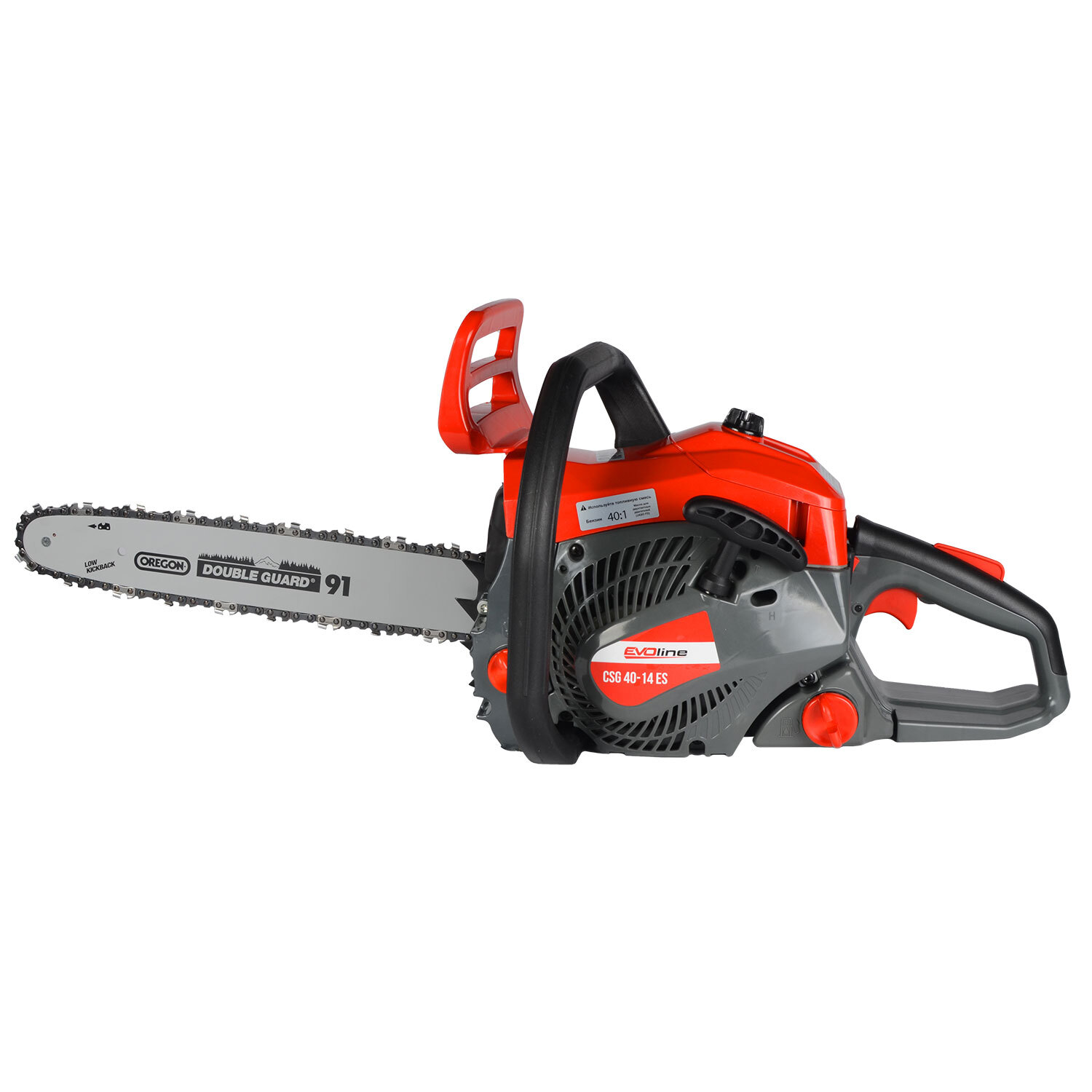 Бензиновая цепная пила EVOline CSG 40-14 ES характеризуется мощностью в 2,4 л.с. и оснащена надежным 2-тактный двигателем (40,2 куб.см) последнего поколения. В комплект CSG 40-14ES входят шина 14 дюймов (36 см) и пильная цепь от американской компании OREGON, чехол для пильной шины, набор инструментов в фирменном чехле и комбинированная канистра для топливной смеси.