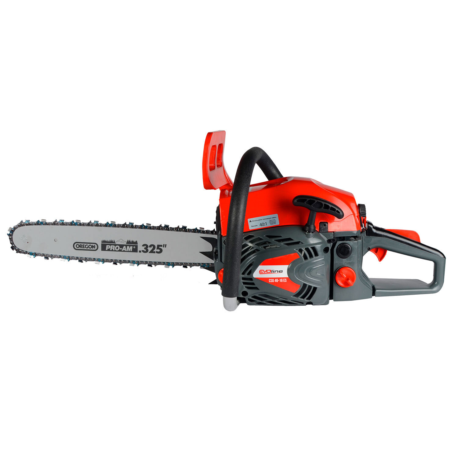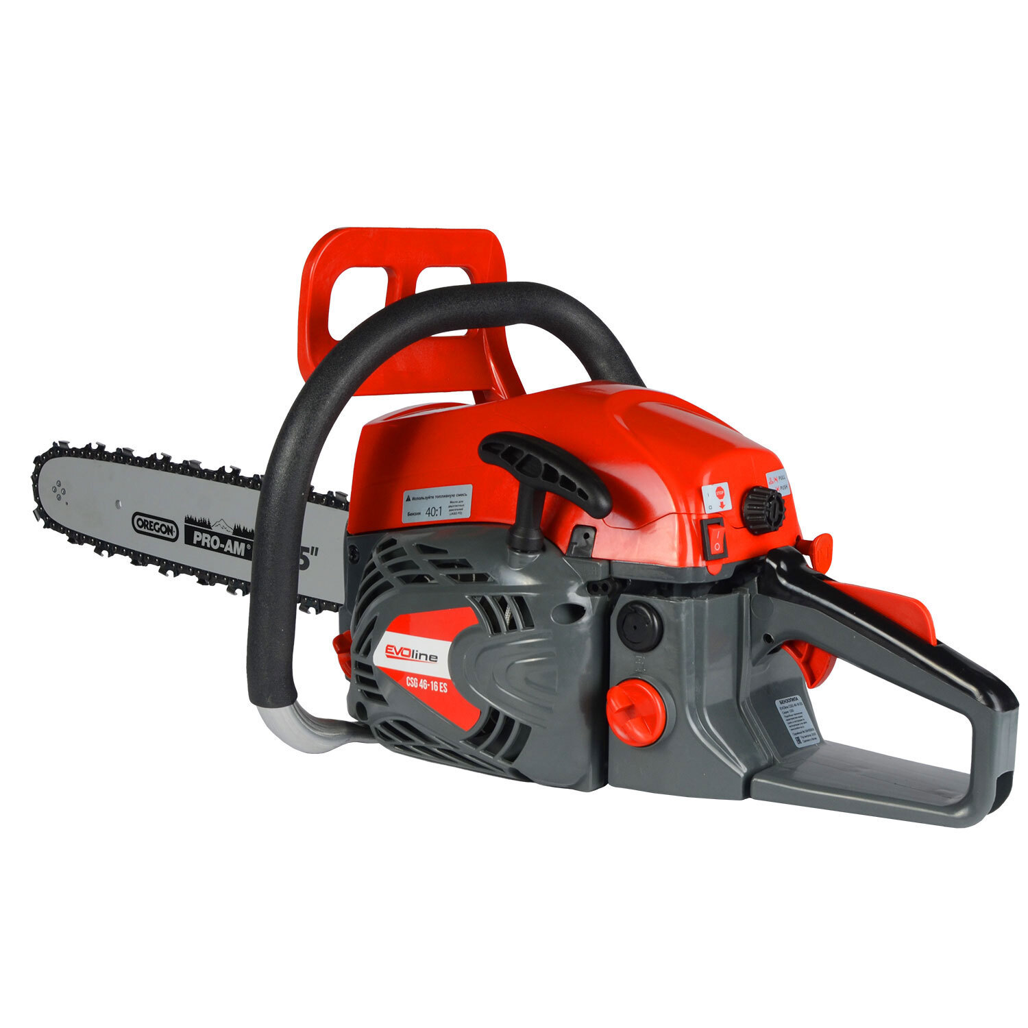 Бензиновая цепная пила EVOline CSG 46-16 ES характеризуется мощностью в 2,4 л.с. и оснащена надежным 2-тактный двигателем (45,6 куб.см) последнего поколения. В комплект CSG 46-16ES входят шина 16 дюймов (41 см) и пильная цепь от американской компании OREGON, чехол для пильной шины, набор инструментов в фирменном чехле и комбинированная канистра для топливной смеси.