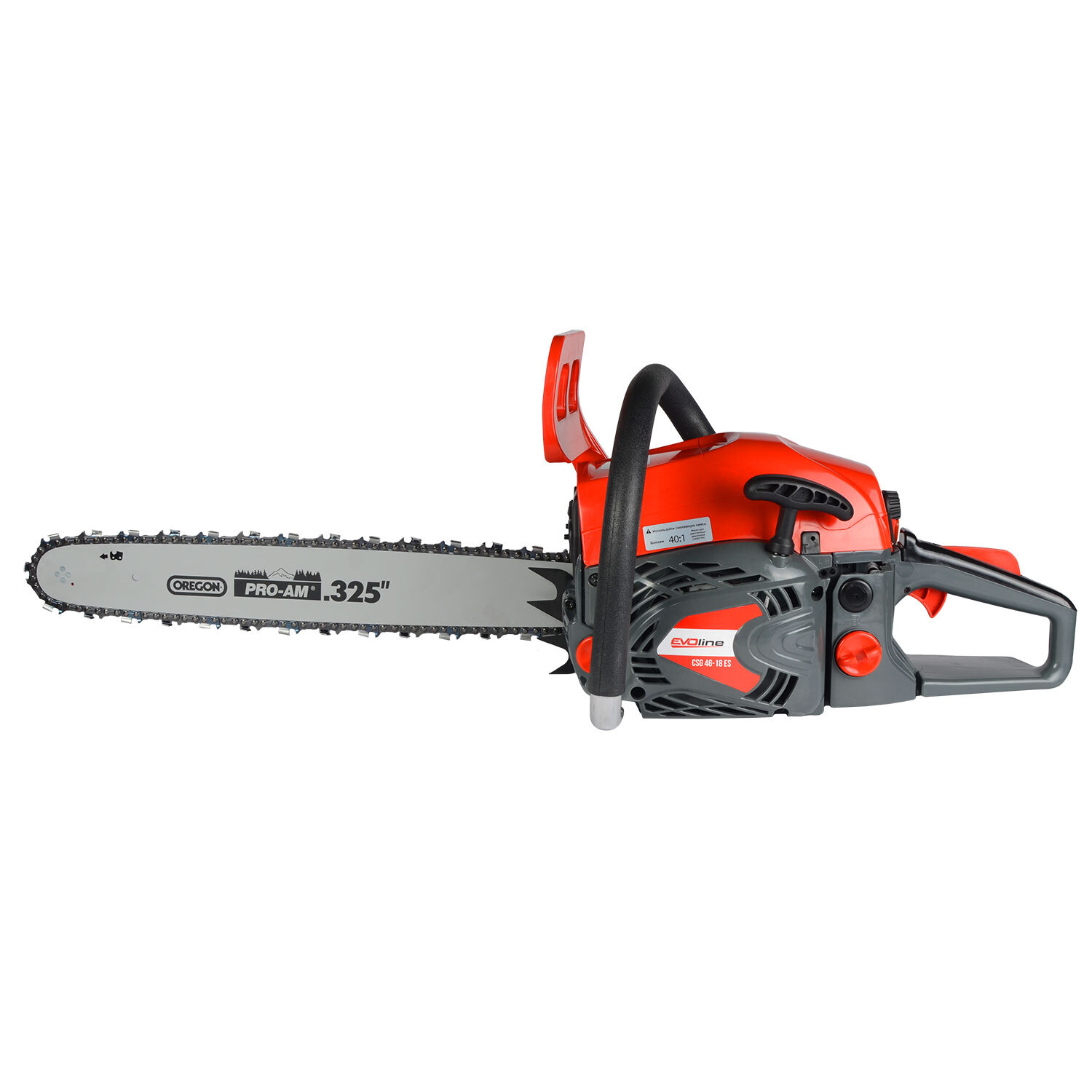 Бензиновая цепная пила EVOline CSG 46-18 ES характеризуется мощностью в 2,4 л.с. и оснащена надежным 2-тактный двигателем (45,6 куб.см) последнего поколения. В комплект CSG 46-18ES входят шина 18 дюймов (46 см) и пильная цепь от американской компании OREGON, чехол для пильной шины, набор инструментов в фирменном чехле и комбинированная канистра для топливной смеси.