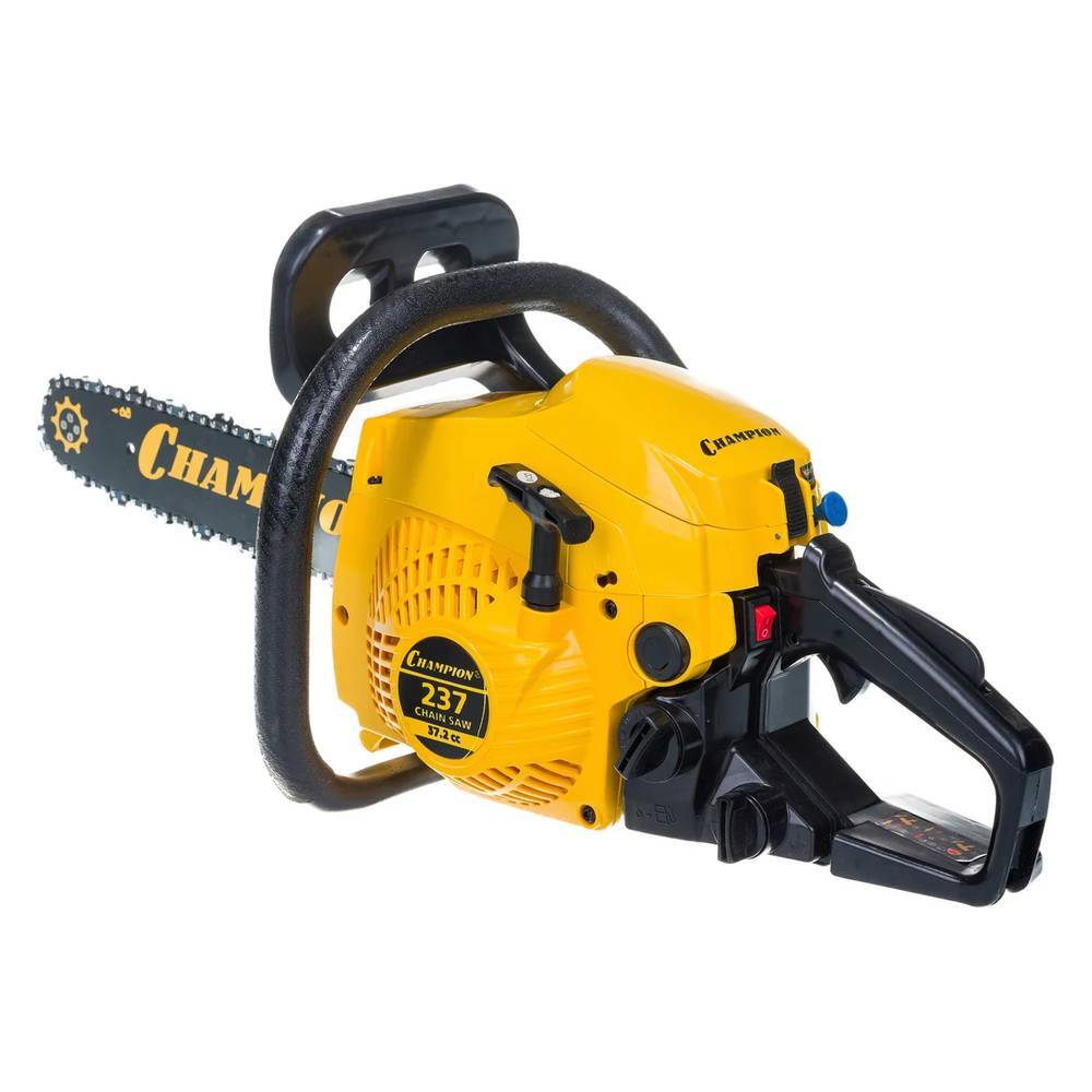 Бензопила Champion 237-16 предназначена для использования в домашнем или приусадебном хозяйстве в таких общих областях применения, как расчистка зарослей кустарника, обрезка ветвей, распиливание дров и т. д. За обеспечение безопасности отвечают уловитель и тормоз цепи, снижающие вероятность травмы оператора при отскоке инструмента или обрыве цепи. При выполнении натяжения цепи исключен контакт с острой цепью пилы.