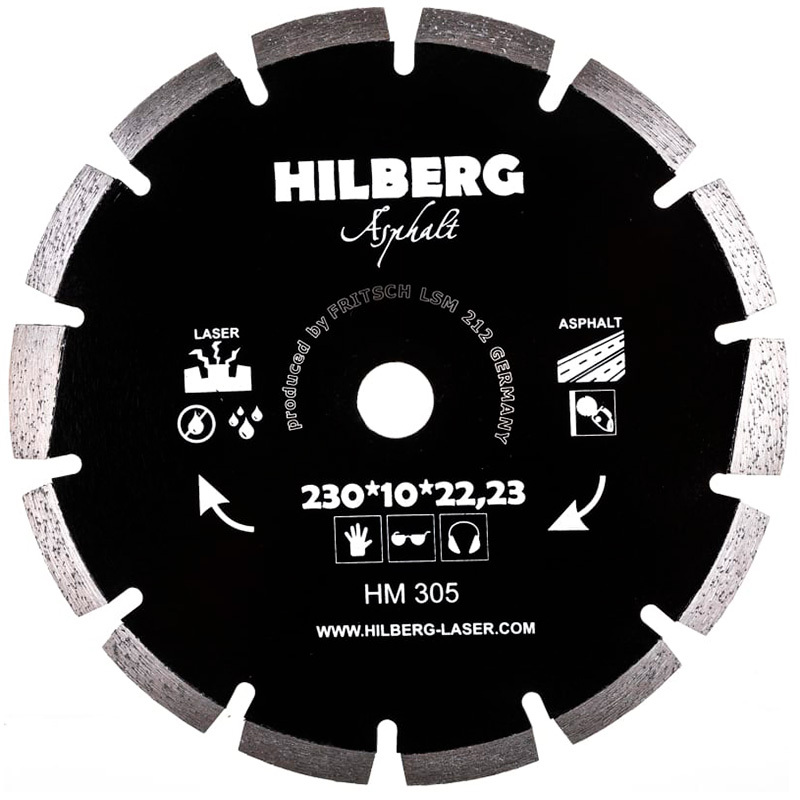 Диск алмазный по асфальту Hilberg Hard Materials 230x22.2мм (HM305) с лазерной наваркой сегментов используется для резки асфальта, свежего бетона и песчаника. Высота алмазного слоя 10мм. Резка осуществляется как с применением водяного охлаждения, так и без. Наличие защитных зубьев обеспечивает увеличенный ресурс и скорость реза. Диск подходит для работы на электрических плиткорезах.
