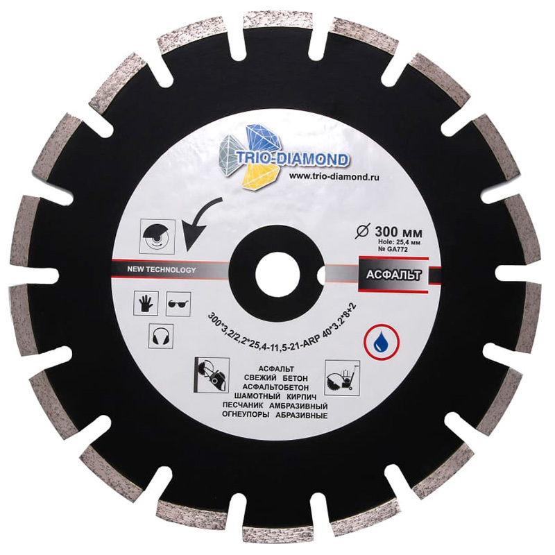 Диск алмазный по асфальту Trio-Diamond 300x25.4мм (GA772) с серебряной пайкой сегментов используется для мокрой резки асфальта, асфальтобетона, свежего бетона и песчаника. Толщина алмазного слоя 3.2мм, а высота 11мм. Используется для работы на плиткорезных станках и нарезчиках швов.