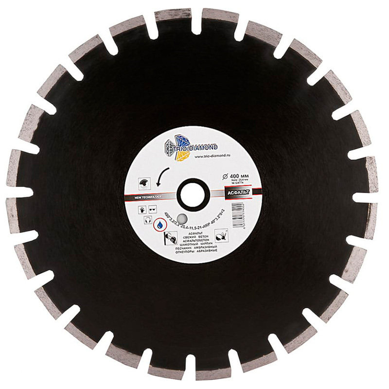 Диск алмазный по асфальту Trio-Diamond 400x25.4мм (GA774) с серебряной пайкой сегментов используется для мокрой резки асфальта, асфальтобетона, свежего бетона и песчаника. Толщина алмазного слоя 3.5мм, а высота 11мм. Используется для работы на плиткорезных станках и нарезчиках швов.