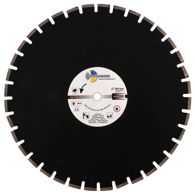 Диск алмазный по асфальту Trio-Diamond 600x25.4мм (GA777) с серебряной пайкой сегментов используется для мокрой резки асфальта, асфальтобетона, свежего бетона и песчаника. Толщина алмазного слоя 4.15мм, а высота 11мм. Используется для работы на плиткорезных станках и нарезчиках швов.