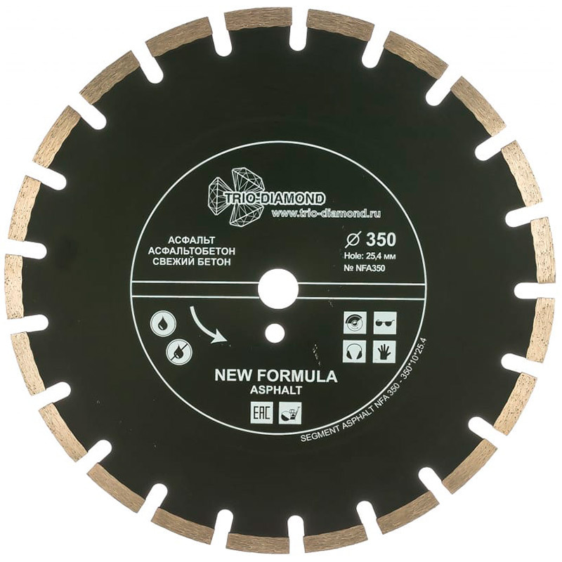 Диск алмазный по асфальту Trio-Diamond New Formula 350x25.4мм (NFA350) изготовлен методом горячего прессования и используется для резки асфальта, асфальтобетона и песчаника. Высота алмазного слоя 10мм. Произведен методом серебряной пайки. Резка осуществляется как с применением водяного охлаждения, так и без. Диск подходит для работы на плиткорезных станках и нарезчиках швов.