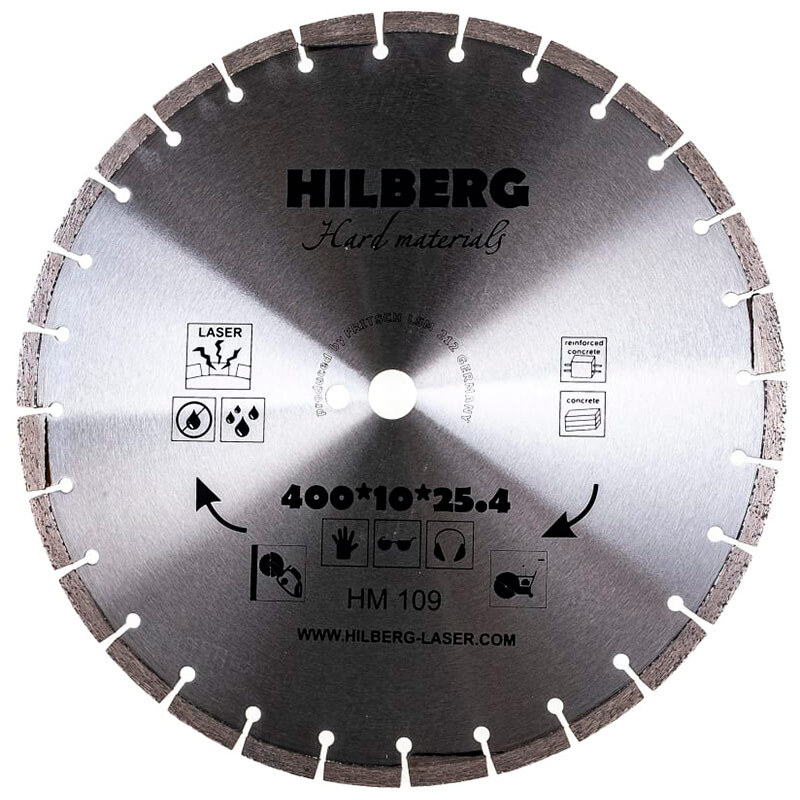 Диск алмазный по бетону Hilberg Hard Materials 400x25.4мм (HM109) с лазерной наваркой сегментов используется для резки армированного бетона, бетона, железобетона, твердого бетона, огнеупоров, гранита. Высота алмазного слоя 10мм. Глубина реза 140 мм. Количество сегментов - 28. Резка осуществляется как с применением водяного охлаждения так и без. Диск подходит для работы на нарезчиках швов.