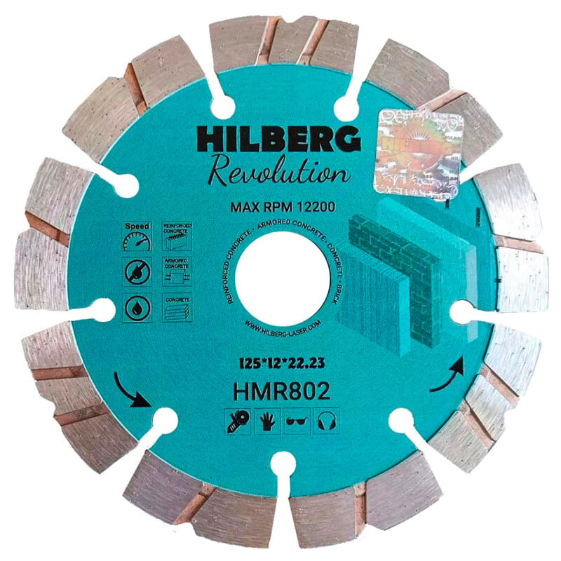 Диск алмазный по бетону Hilberg Revolution 125x22.2мм (HMR802) изготовлен методом горячего прессования. Используется для резки бетона, слабо армированного бетона, тротуарной плитки, кирпича, бордюрного и натурального камня. Толщина алмазного слоя 2.2мм, а высота 12мм.