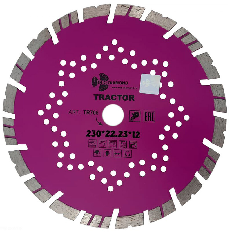 Диск алмазный по бетону и камню Trio-Diamond 230x22.2мм (TR706) выполнен методом горячего прессования. Используется для резки железобетона, бетона, бордюрного камня, натурального камня, тротуарной плитки, кирпича. Высота алмазного слоя составляет 12мм. Подходит для работы на УШМ.