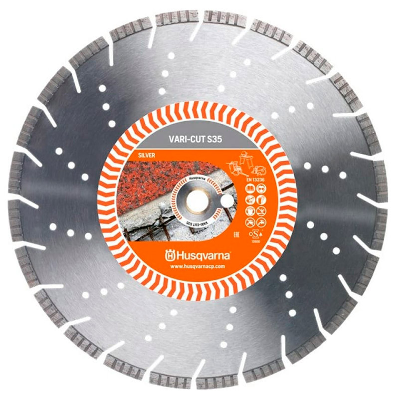 Диск алмазный по бетону и кирпичу Husqvarna VARI-CUT S35 350x25.4мм (5879058-01) предназначен для гранита, мрамора, природного камня, затвердевшего бетона средней жесткости, а также армированного бетона и кирпича. "Easy-fit" - система изменения диаметра посадочного отверстия с 20мм на 25.4мм.