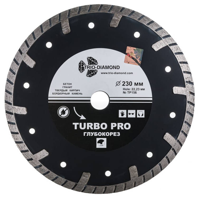 Диск алмазный по бетону и кирпичу Trio-Diamond Турбо Глубокорез Pro 230х22,2мм (TP156) используется для резки гранита, твердого бетона, огнеупоров, кирпича и бордюрного камня. Толщина алмазного слоя 2,8мм, высота 10мм. Глубина реза составляет 60мм. Диск имеет рифленую кромку, компенсационные отверстия и дополнительные защитные сектора, которые позволяют избежать боковой износ. Диск обладает повышенной производительностью и стойкостью.