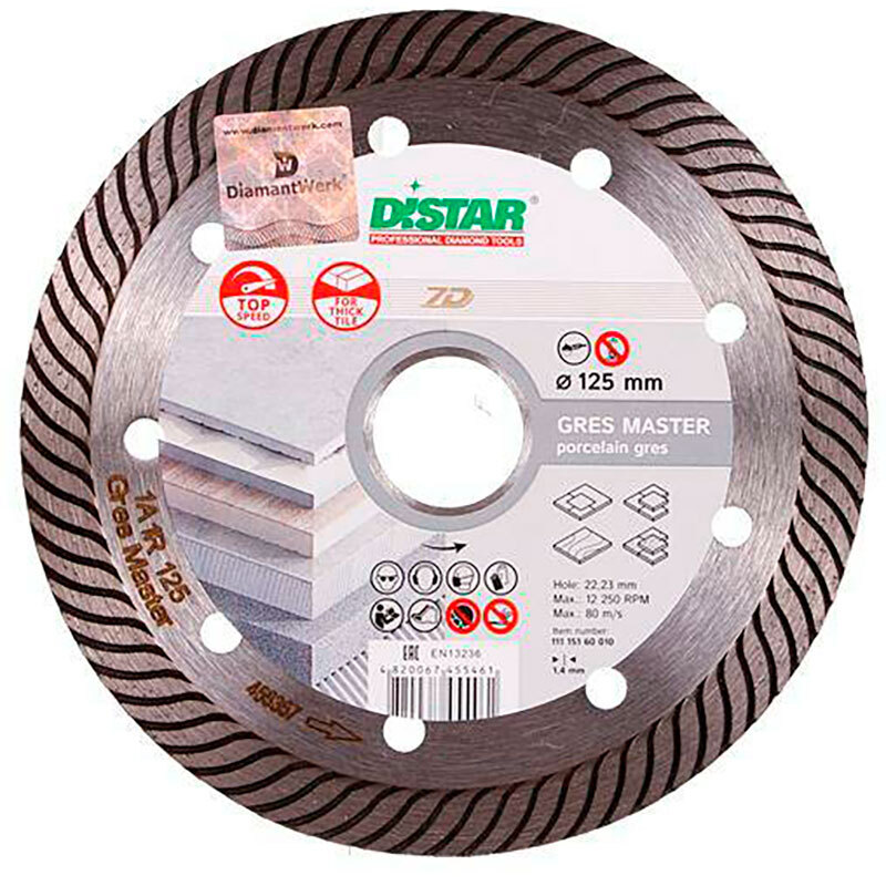 Диск алмазный по граниту, мрамору и керамограниту Distar 1A1R 125х22.2мм (0012) предназначен для ручных УШМ. Подходит для реза большинства природных пород: все виды гранита и мрамора.