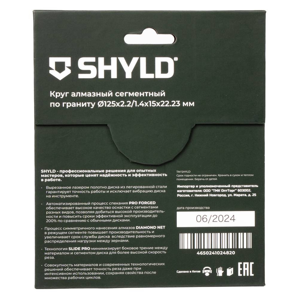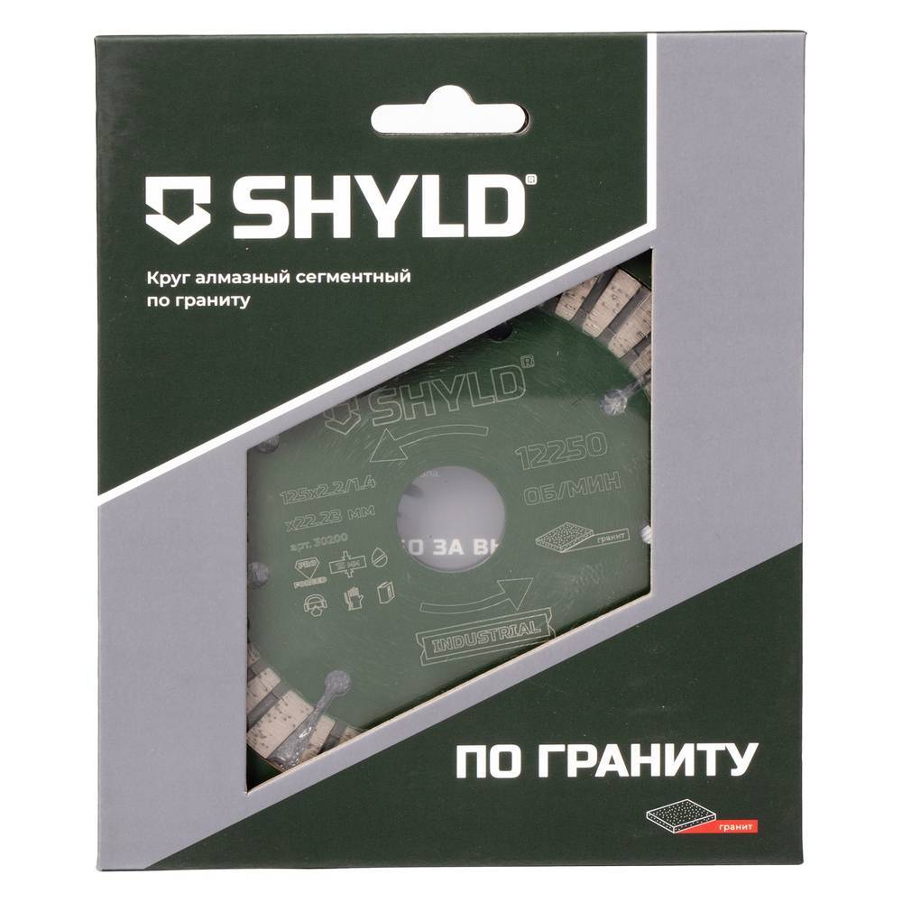 Диск алмазный по граниту SHYLD 125х22.2мм (30200) предназначен для резания гранита ручным электроинструментом таким как МШУ. Сухой рез. Вырезанное лазером полотно диска из легированной стали гарантирует точность работы и исключает вибрацию диска на инструменте. Автоматизированный процесс спекания PRO FORGED обеспечивает высокое качество оснастки с сегментами разных видов, позволяя добиться высокой производительности и повысить сроки эффективной эксплуатации до 200% по сравнению с обычными дисками. Процесс симметричного нанесения алмазов DIAMOND NET в режущем сегменте повышает производительность и увеличивает срок службы диска вследствие равномерного распределения нагрузки между зернами. Технология SLIDE PRO минимизирует боковое трение между материалом и сегментом для более высокой скорости реза. Совокупность материала и современных технологических решений обеспечивает точность реза даже при интенсивном использовании, сохраняя свойства после множества рабочих циклов.