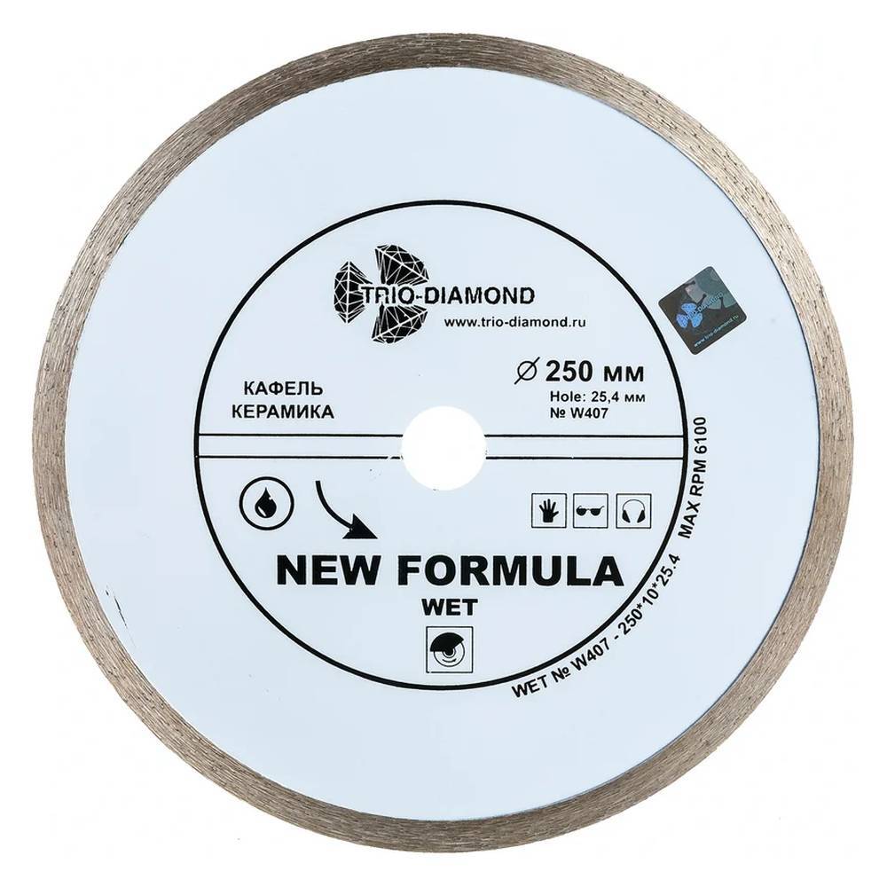 Диск алмазный по керамике Trio-Diamond 250х25.4мм (W407) используется для резки низкоабразивных материалов: керамики, кафеля, керамической плитки и мрамора. Диск изготовлен по технологии холодного прессования. Толщина алмазного слоя 3мм, а высота 11мм. Посадочное отверстие – 25.4мм. Глубина реза составляет 60мм. Резка осуществляется с применением водяного охлаждения. Сплошная режущая кромкой обеспечивает гладкий рез без сколов. Диск подходит для работы на УШМ.