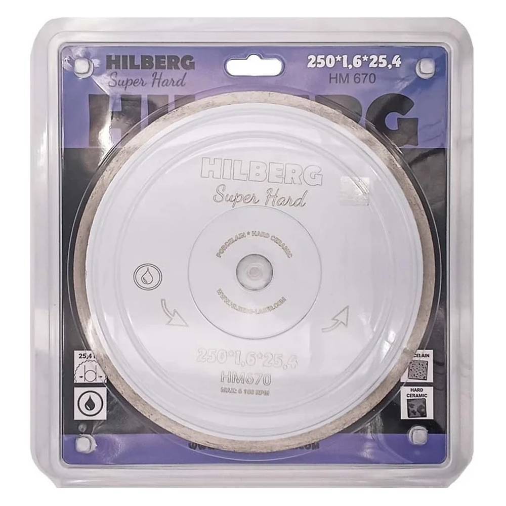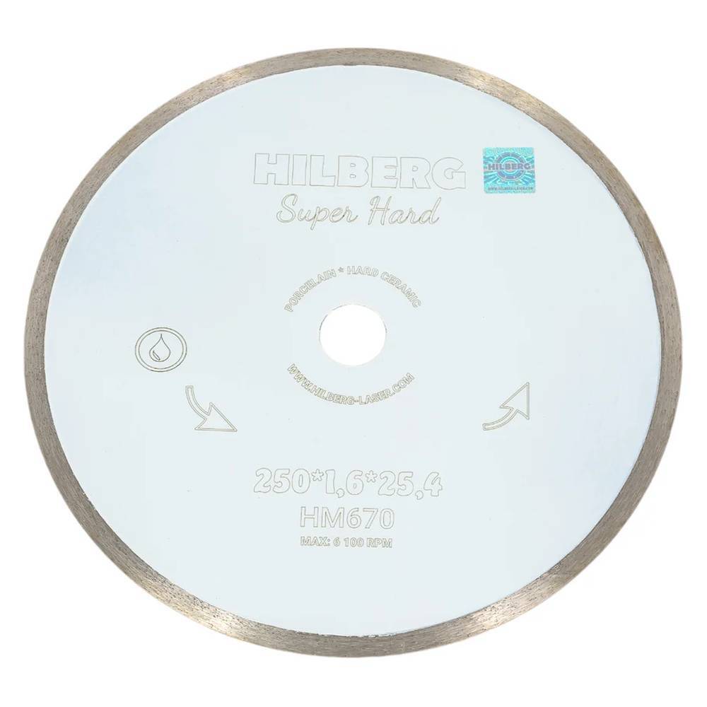Диск алмазный по керамограниту Hilberg Super Hard 250х25.4мм (HM670) - высококачественный алмазный отрезной диск с ультратонкой режущей кромкой для чистого реза без сколов по твердым материалам. Применяется на плиткорезных и камнерезных станках с водяным охлаждением. Выполнен методом горячего прессования.