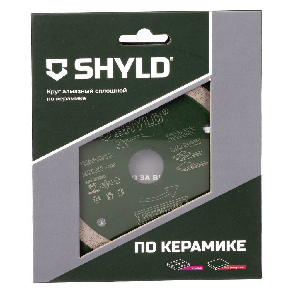 Диск алмазный по керамограниту и плитке SHYLD 125х1.6х22.2мм (30230) предназначен для сухого реза по керамике, твердому керамограниту и природному камню. Вырезанное лазером полотно диска из легированной стали гарантирует точность работы и исключает вибрацию диска на инструменте. Автоматизированный процесс спекания PRO FORGED обеспечивает высокое качество оснастки с сегментами разных видов, позволяя добиться высокой производительности и повысить сроки эффективной эксплуатации до 200% по сравнению с обычными дисками. Процесс симметричного нанесения алмазов DIAMOND NET в режущем сегменте повышает производительность и увеличивает срок службы диска вследствие равномерного распределения нагрузки между зернами. Технология SLIDE PRO минимизирует боковое трение между материалом и сегментом для более высокой скорости реза. Совокупность материала и современных технологических решений обеспечивает точность реза даже при интенсивном использовании, сохраняя свойства после множества рабочих циклов.