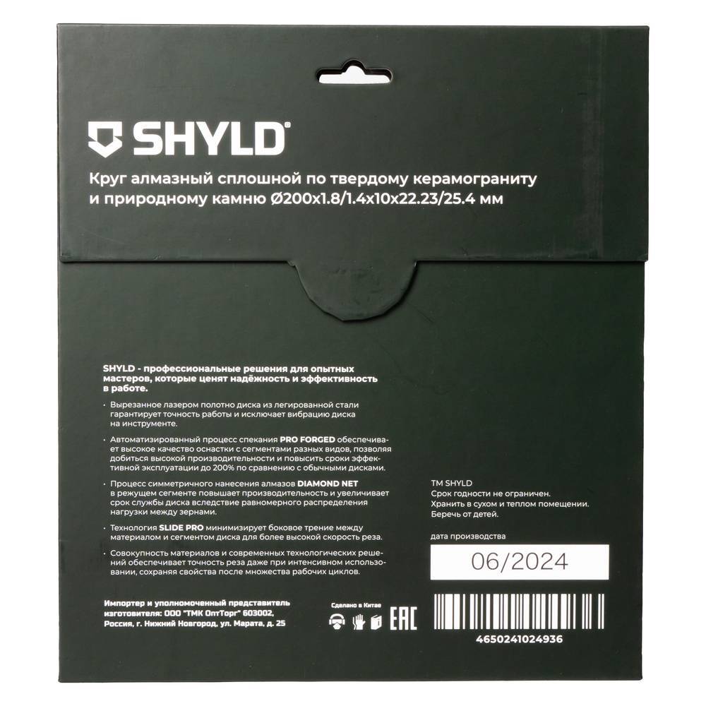 Диск алмазный по керамограниту и природному камню SHYLD сплошной 200х1.6х22.2/25.4мм (30330) предназначен для сухого реза материала ручным электроинструментом таким как МШУ. Вырезанное лазером полотно диска из легированной стали гарантирует точность работы и исключает вибрацию диска на инструменте. Автоматизированный процесс спекания PRO FORGED обеспечивает высокое качество оснастки с сегментами разных видов, позволяя добиться высокой производительности и повысить сроки эффективной эксплуатации до 200% по сравнению с обычными дисками. Процесс симметричного нанесения алмазов DIAMOND NET в режущем сегменте повышает производительность и увеличивает срок службы диска вследствие равномерного распределения нагрузки между зернами. Технология SLIDE PRO минимизирует боковое трение между материалом и сегментом для более высокой скорости реза. Совокупность материала и современных технологических решений обеспечивает точность реза даже при интенсивном использовании, сохраняя свойства после множества рабочих циклов.