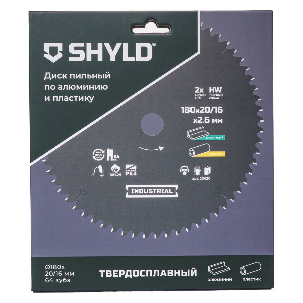 Диск пильный по алюминию и пластику SHYLD 180х20/16мм 64Т (20620) обеспечивает чистый рез алюминия и твердого пластика. Диск изготовлен из высококачественной стали и затем закален до значения 46 по шкале твердости Роквелла. Твердосплавные напайки с заточкой SMART SHARP обеспечивают быстрый и чистый рез, исключая появление сколов на обрабатываемом материале. Тефлоновое покрытие диска значительно снижает нагревание диска и делает работу более чистой.