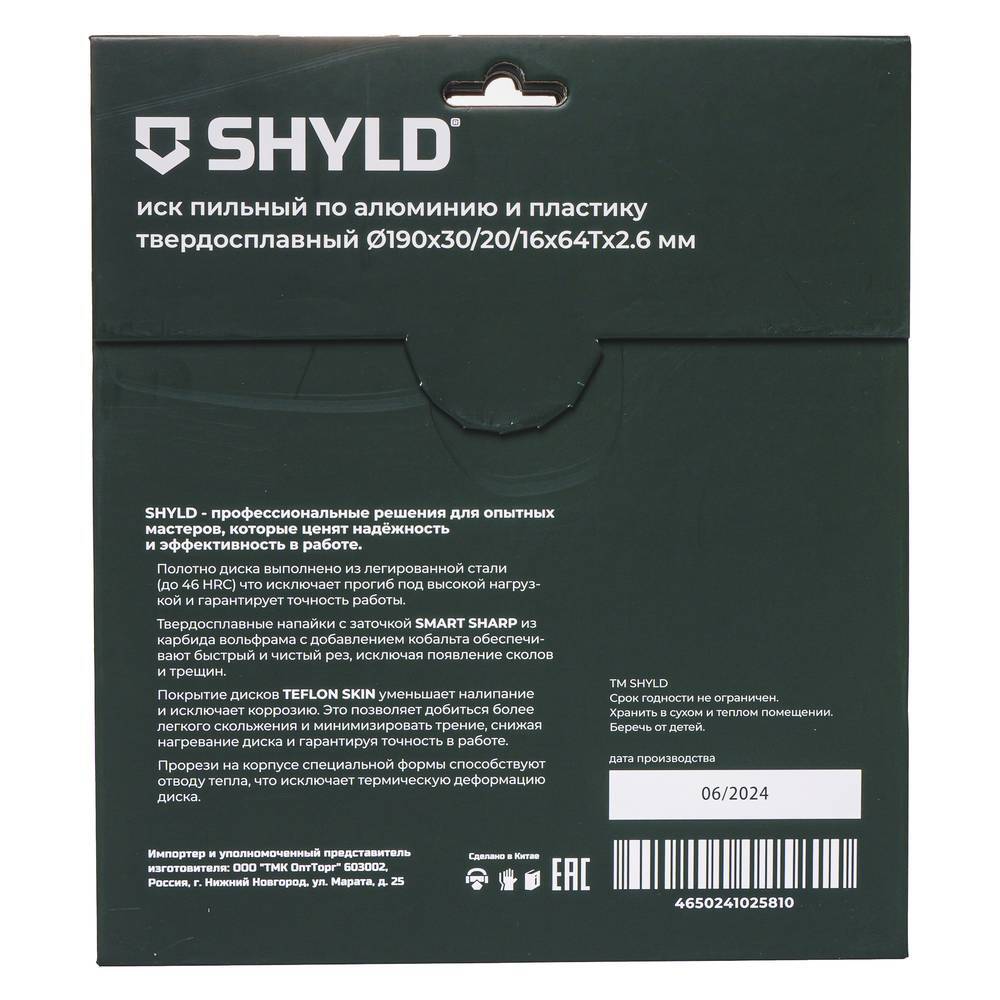 Диск пильный по алюминию и пластику SHYLD 190х30/20/16мм 64Т (20640) обеспечивает чистый рез алюминия и твердого пластика. Диск изготовлен из высококачественной стали и затем закален до значения 46 по шкале твердости Роквелла. Твердосплавные напайки с заточкой SMART SHARP обеспечивают быстрый и чистый рез, исключая появление сколов на обрабатываемом материале. Тефлоновое покрытие диска значительно снижает нагревание диска и делает работу более чистой.