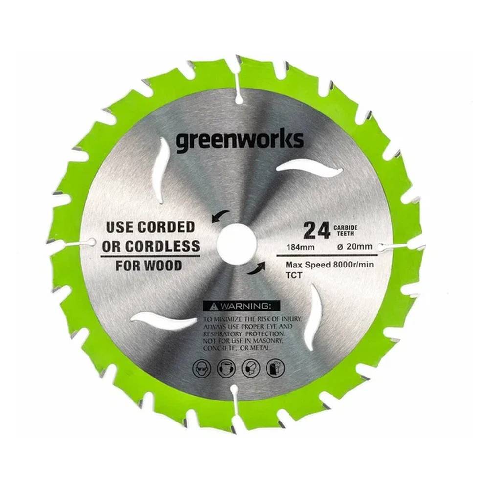 Диск пильный по дереву Greenworks 184x20мм 24T (2943407) предназначен для аккумуляторной циркулярной пилы Greenworks GD24CS 24V. С помощью диска можно распиливать деревянные изделия: доски, брус, фанеру, ДСП, ДВП, древесные панели с покрытием.