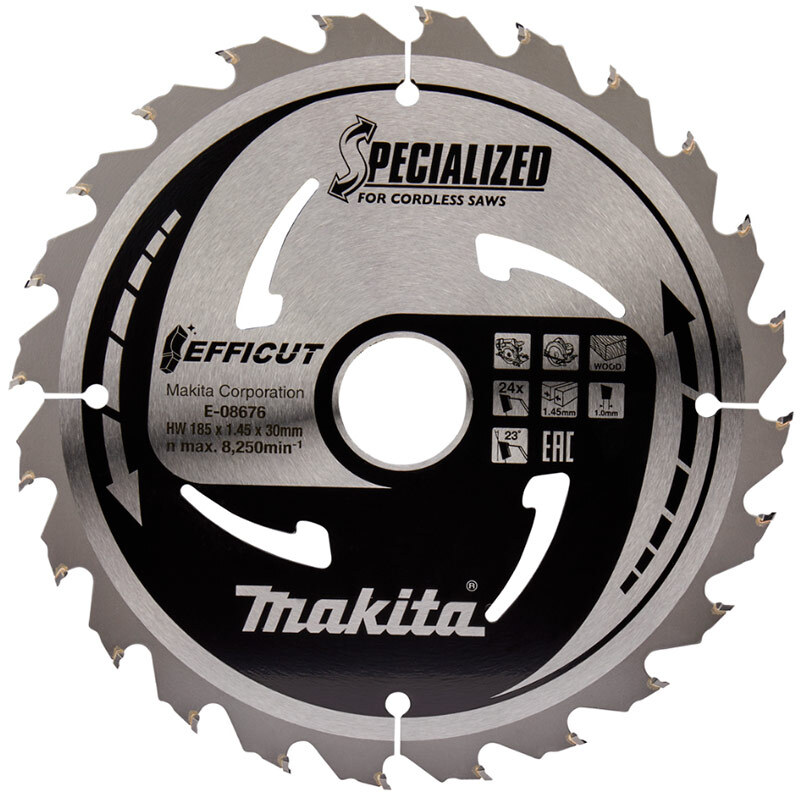 Диск пильный по дереву Makita 185x30мм 24T (E-08676) подходит для любых сортов древесины, может использоваться для продольного и поперечного распила.