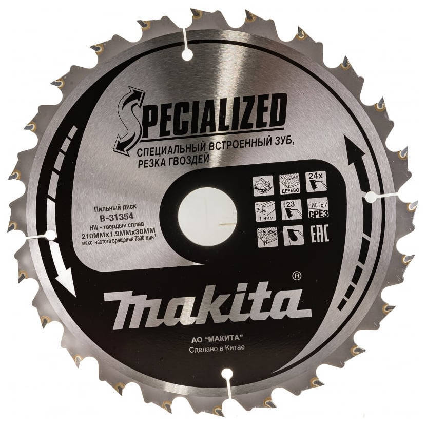 Диск пильный по дереву Makita 210x30мм 24T (B-31354) используется для распила старых пиломатериалов, опалубки, древесины с гвоздями при проведении демонтажных работ.