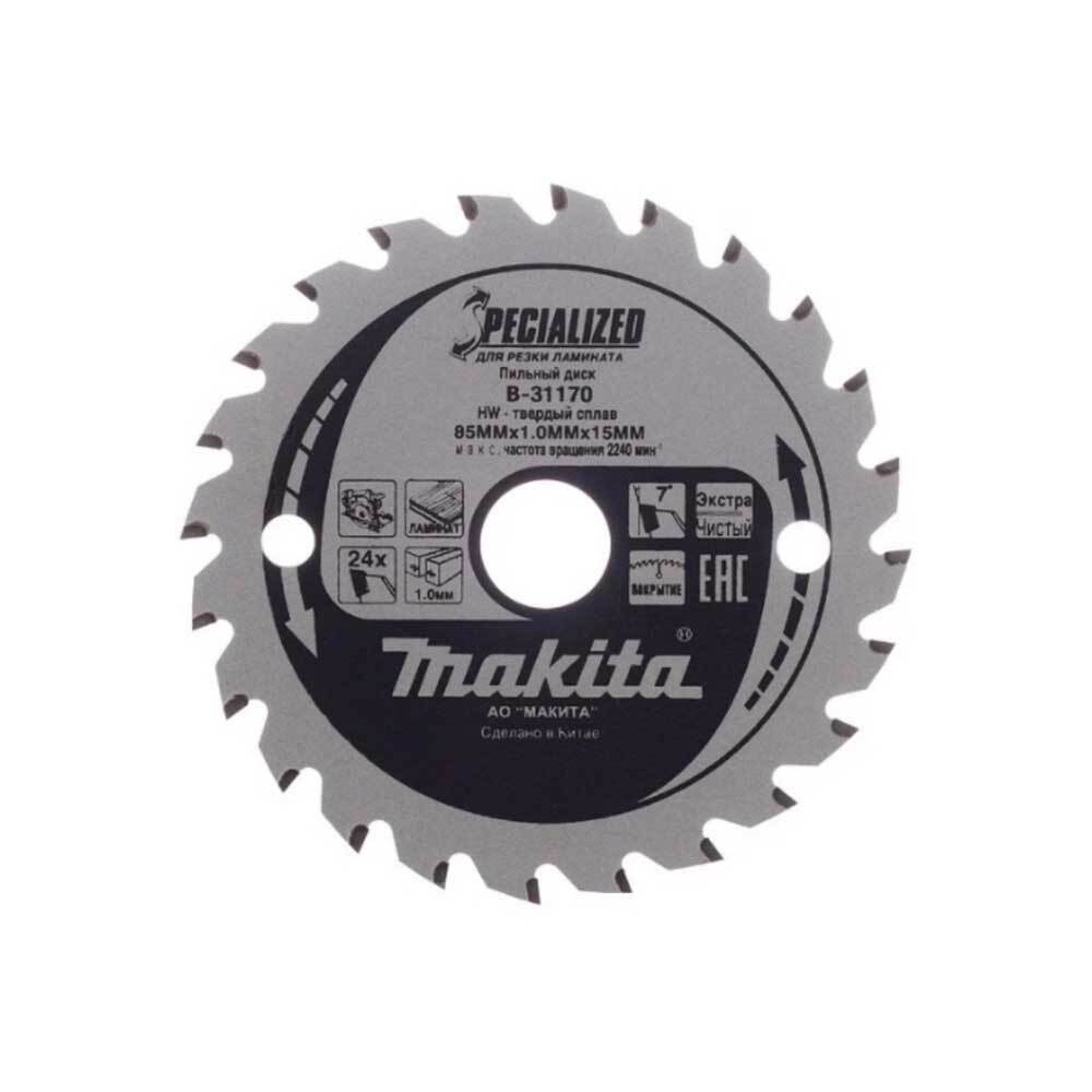 Диск пильный Makita B-31170. Диаметр диска 85 мм. Посадочный диаметр диска 15 мм. Количество зубьев 24 шт. Толщина 0.7 мм. Ширина пропила 1 мм. Максимальное количество оборотов 2240 об/мин. Твердосплавный. Тип реза - продольный, чистый, поперечный. Материал обработки - дерево.