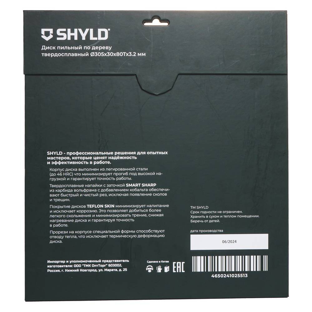 Диск пильный по дереву SHYLD 305х30мм 80Т (20340) обеспечивает чистый рез древесины и ДСП. Диск изготовлен из высококачественной стали и затем закален до значения 46 по шкале твердости Роквелла. Твердосплавные напайки с заточкой SMART SHARP обеспечивают быстрый и чистый рез, исключая появление сколов на обрабатываемом материале. Тефлоновое покрытие диска значительно снижает нагревание диска и делает работу более чистой.