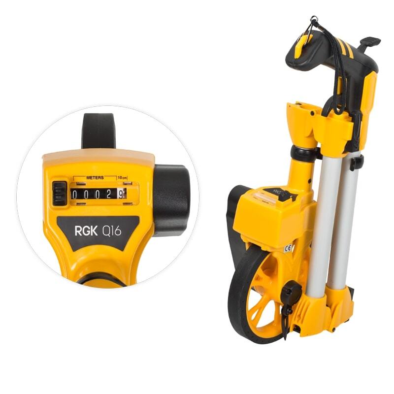 Дорожное колесо RGK Q16 диаметром 160 мм и измеряет расстояния там, где невозможно или нецелесообразно применять мерные ленты или лазерные дальномеры, например, при разметке дорожного полотна или фиксировании параметров при ДТП. Прибор удобен при измерениях при неблагоприятных погодных условиях за счет надежного механического счетчика. Основные характеристики дорожного колеса RGK Q16: диаметр колеса 160 мм; складной корпус; тормоз; кнопка сброса на рукоятке; вес 1.038 кг. Колесо диаметром 160 мм позволяет выполнять измерения одинаково точно, как на ровных поверхностях, так и на бугристых, таких как газон или грунт. Дорожное колесо RGK Q16 с шиной из полиуретанового покрытия обеспечивает высокую точность результатов на таких поверхностях, как асфальт, бетон или брусчатка. Кнопка тормоза дорожного колеса RGK Q16 предназначена для фиксирования измеренного расстояния на счетчике и расположена на рукоятке. Это позволяет избежать погрешности в ситуациях, когда для считывания результата нужно поднять колесо. Сброс измеренных расстояний осуществляется отдельной кнопкой. Она расположена на рукоятке дорожного колеса RGK Q16, поэтому не нужно каждый раз наклоняться или поднимать курвиметр для сброса показаний, что удобно при измерении линейно протяженных объектов. Корпус дорожного колеса RGK Q16 выполнен из ударопрочного ABS-пластика. За счет небольшого веса 0.518 кг, прибор удобно использовать в течение длительного времени. Благодаря складной конструкции, дорожное колесо не займет много места при транспортировке, так как его длина в сложенном состоянии всего 43 см.