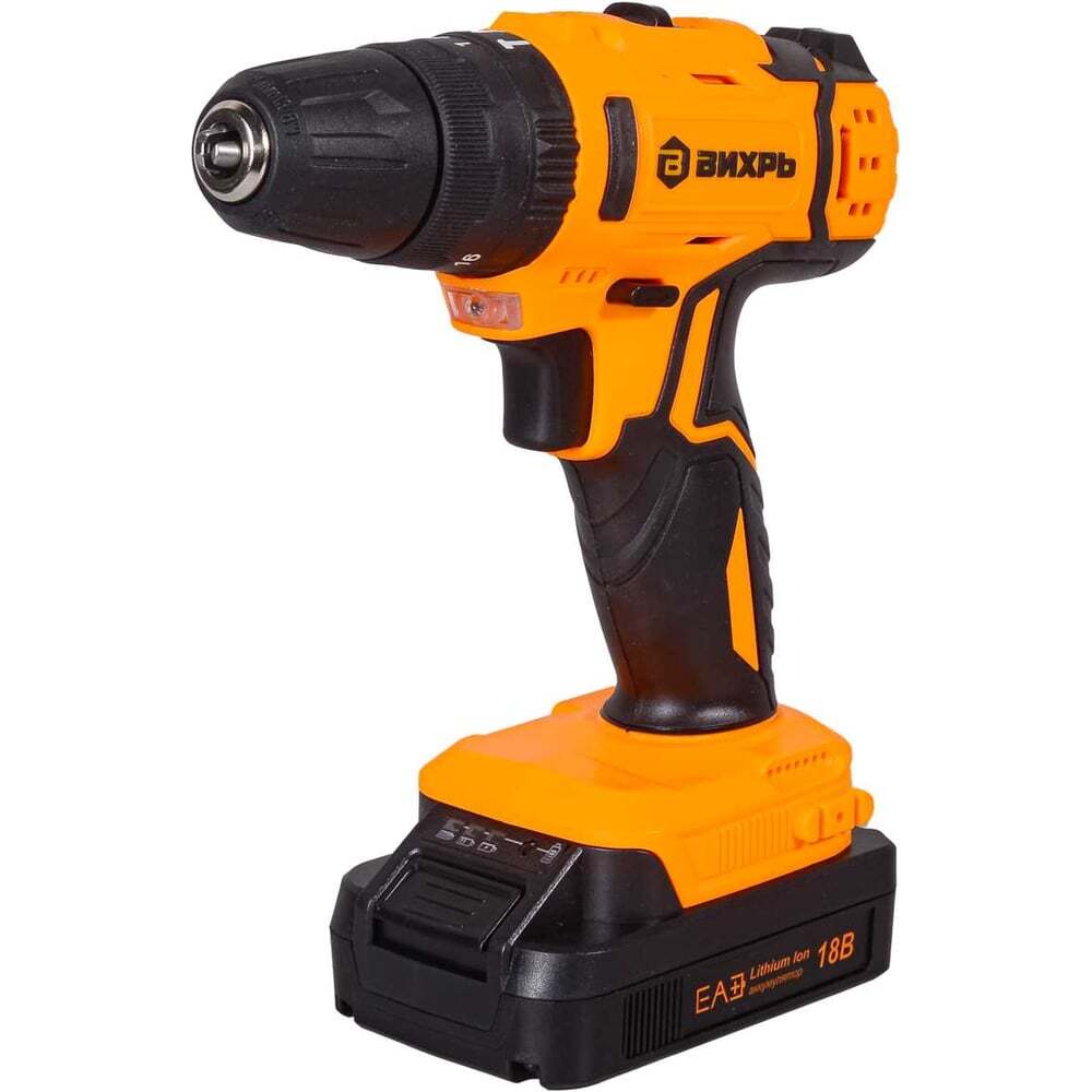 Дрель-шуруповерт ВИХРЬ ДА-18Л-2КУ с режимами удара и реверса, 2 аккумуляторами и 2 скоростями станет оптимальной заменой ручному инструменту, облегчит сверление отверстий в металле, дереве, пластике и бетоне, вкручивание и выкручивание крепежа.Устройство оснащено 2 литий-ионными аккумуляторами с увеличенным числом циклов зарядки-разрядки и большой емкостью (2 А*ч). Дрель-шуруповерт может работать в нескольких режимах. Прямой ход на скорости до 400 и 1400 об/мин обеспечит быстрое сверление и закручивание шурупов. Реверсный ход поможет изъять застрявшее в стене сверло и выкрутить метизы. Отличительной особенностью модели является наличие режима удара, что позволяет использовать ее в качестве ударной дрели для работы с бетонными поверхностями. Удлиненная форма обеспечит доступ в любое труднодоступное место, наличие подсветки улучшит видимость при проведении работ. Корпус инструмента выполнен из прочного пластика, в зоне расположения мотора имеются отверстия для вентилирования. Ручка покрыта антискользящим материалом. Вес инструмента – 1,3 кг.Эффективная, надежная, простая в использовании аккумуляторная модель ВИХРЬ ДА-18Л-2КУ будет полезна при проведении частых или длительных работ с крепежом, поможет подготовить отверстия в любых материалах, включая бетон.