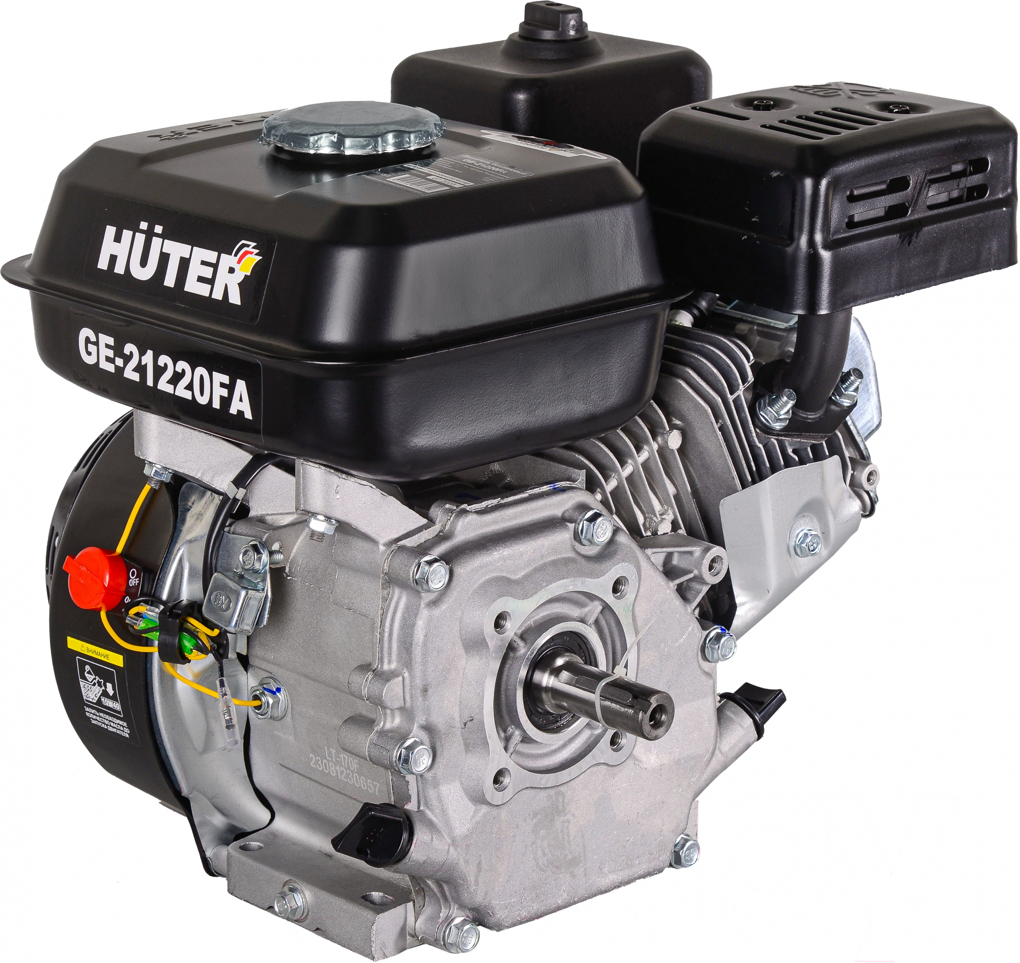 Четырехтактный одноцилиндровый двигатель HUTER GE-21220FА используется для работы мотоблоков, снегоуборочных машин, измельчителей и другой садовой и сельскохозяйственной техники. Модель с рабочим объёмом двигателя 212 см³ оснащена системой воздушного охлаждения. Выходной вал диаметром 20 мм имеет соединение типа шпонки. Автоматический регулятор частоты вращения контролирует необходимую интенсивность работы. В качестве топлива двигатель использует бензин АИ-92. Бак объемом 3,6 л обеспечивает длительную эксплуатацию без дополнительной заправки. Двигатель HUTER GE-21220FА устойчив к вибрации и имеет низкий уровень шума. Запуск осуществляется с помощью ручного стартера, эффективного при любых погодных условиях. Объем картера, заполненного маслом, составляет 0,6 л. Датчик уровня смазки исключает запуск устройства при недостаточном ее количестве.