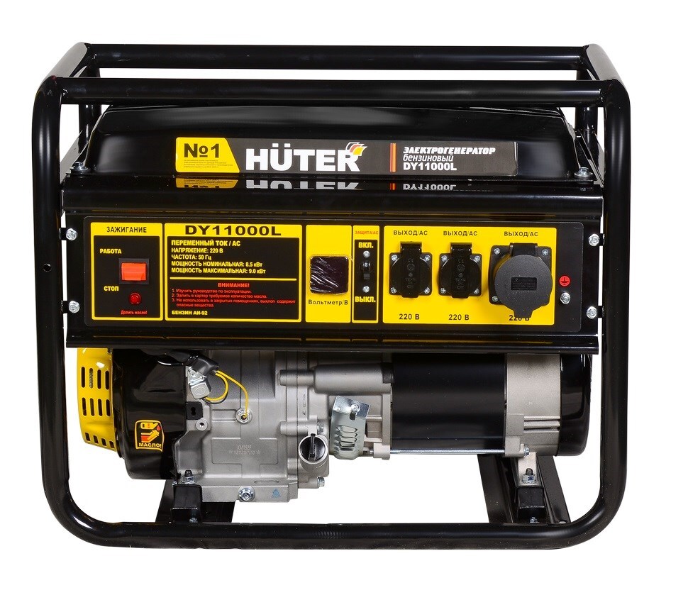 Бензиновый генератор Huter DY11000L – оснащён 4-тактным одноцилиндровым бензиновым двигателем с воздушным охлаждением мощностью 19л.с. Он работает на неэтилированном бензине АИ92, емкость топливного бака составляет 25л, системы смазки – 1100мл. Бензогенератор имеет защитные системы от перегрузок и коротких замыканий. В нем также реализована функция защиты от низкого уровня масла, которая заключается в том, что его попросту невозможно запустить, если уровень будет ниже допустимого. Генератор надежный, экономичный и простой в эксплуатации. Его силовой агрегат относится к категории двигателей с повышенным рабочим ресурсом.