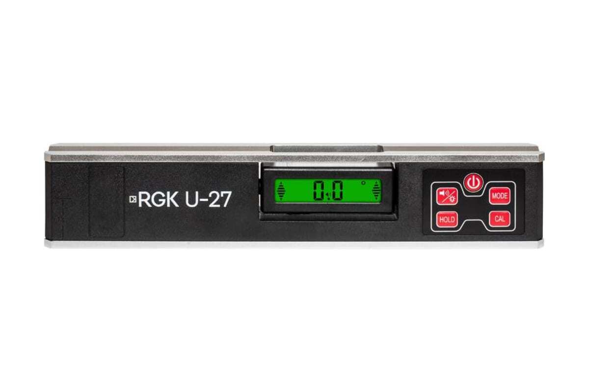 В зависимости от выбранного режима электронный уровень RGK U27 может показывать значение углов в градусах и процентах отклонения от горизонтали. Также имеется динамик, с помощью которого уровень издает звуковой сигнал при приближении к нулевому значению. Тональность сигнала меняется в зависимости от положения прибора, что дает возможность выравнивать строительные детали, не считывая показатели с экрана.