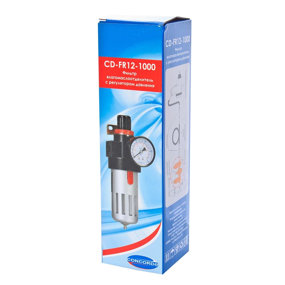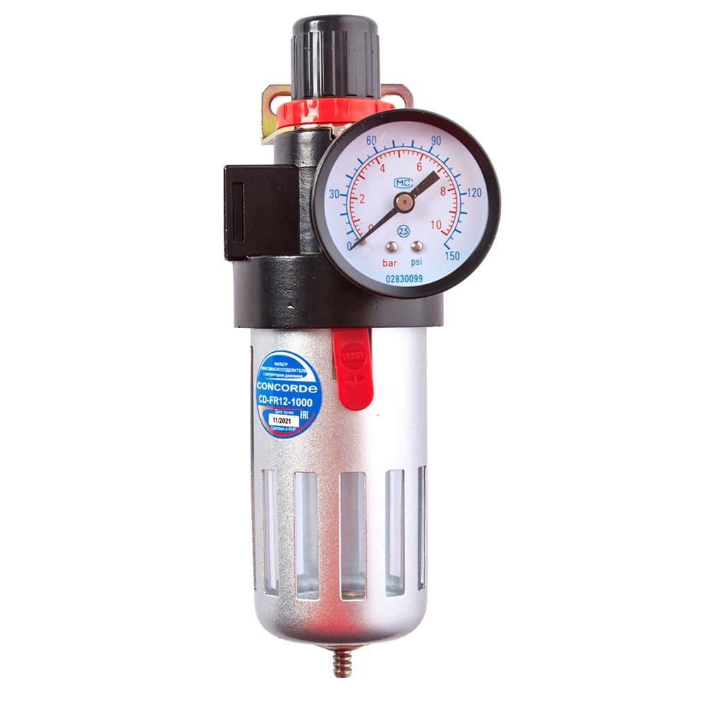 Фильтр влагомаслоотделитель с регулятором давления Concorde CD-FR12-1000 степень фильтрации 40мкм. Устанавливается в магистраль с сжатым воздухом. Имеет два резьбовых соединения (вход /выход) 1/2" в верхней металлической части и прозрачную емкость с клапаном слива конденсата в нижней части. Предназначен для очистки воздуха, поступающего из компрессора, от влаги и частиц масла. Оборудован регулятором давления воздуха с манометром для оптимальной работы пневмоинструмента.