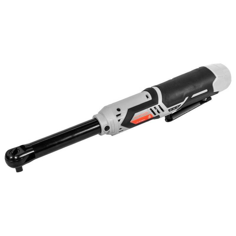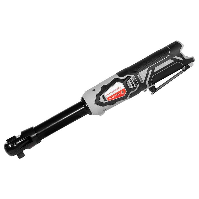 Угловой гайковерт с храповым механизмом является специализированным инструментом. Вращающий момент образуется за счет взаимодействия эксцентрика с храповиком. На самом храповике имеется интуитивно понятный переключатель направления вращения. Гайковерт оборудован удобным рычагом включения нажимного типа (с кнопкой предотвращения случайного включения), светодиодом локальной подсветки и указателем остаточного заряда батареи.