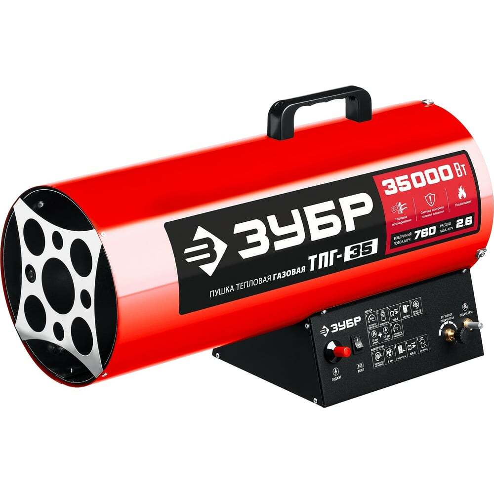 Газовая тепловая пушка ЗУБР 35 кВт ТПГ-35 - высокоэффективный газовый обогреватель, работающий на наиболее распространенном виде топлива. Оптимально подходит для использования на открытых и полузакрытых площадках для просушки и обогрева, размораживания траншей и аварийного прогрева помещений, а так же для монтажа натяжных потолков. Надежный поджиг дуги и эффективное горение гарантируют безотказную подачу тепла в любых условиях эксплуатации. Применяется для генерации горячего воздуха, который может быть использован для обогрева, сушки промышленных, складских, вспомогательных помещений и т. д.