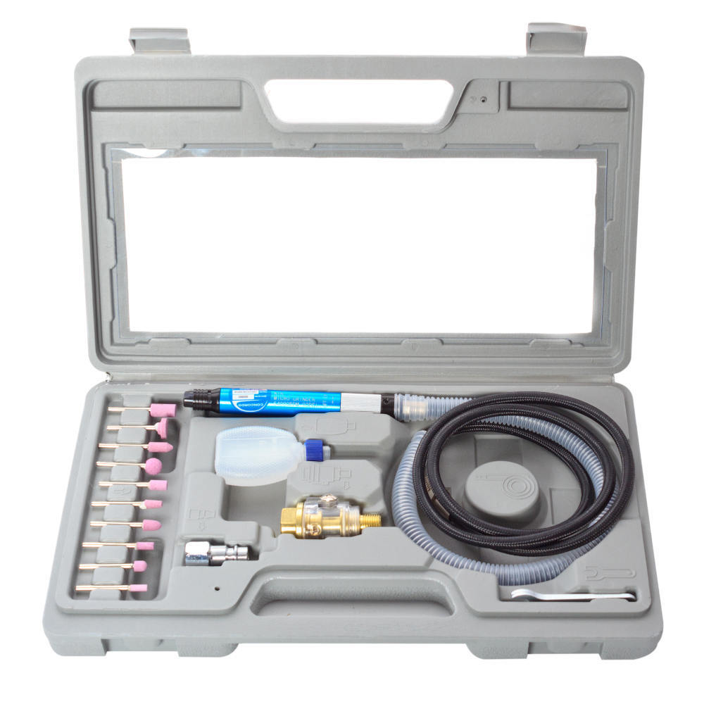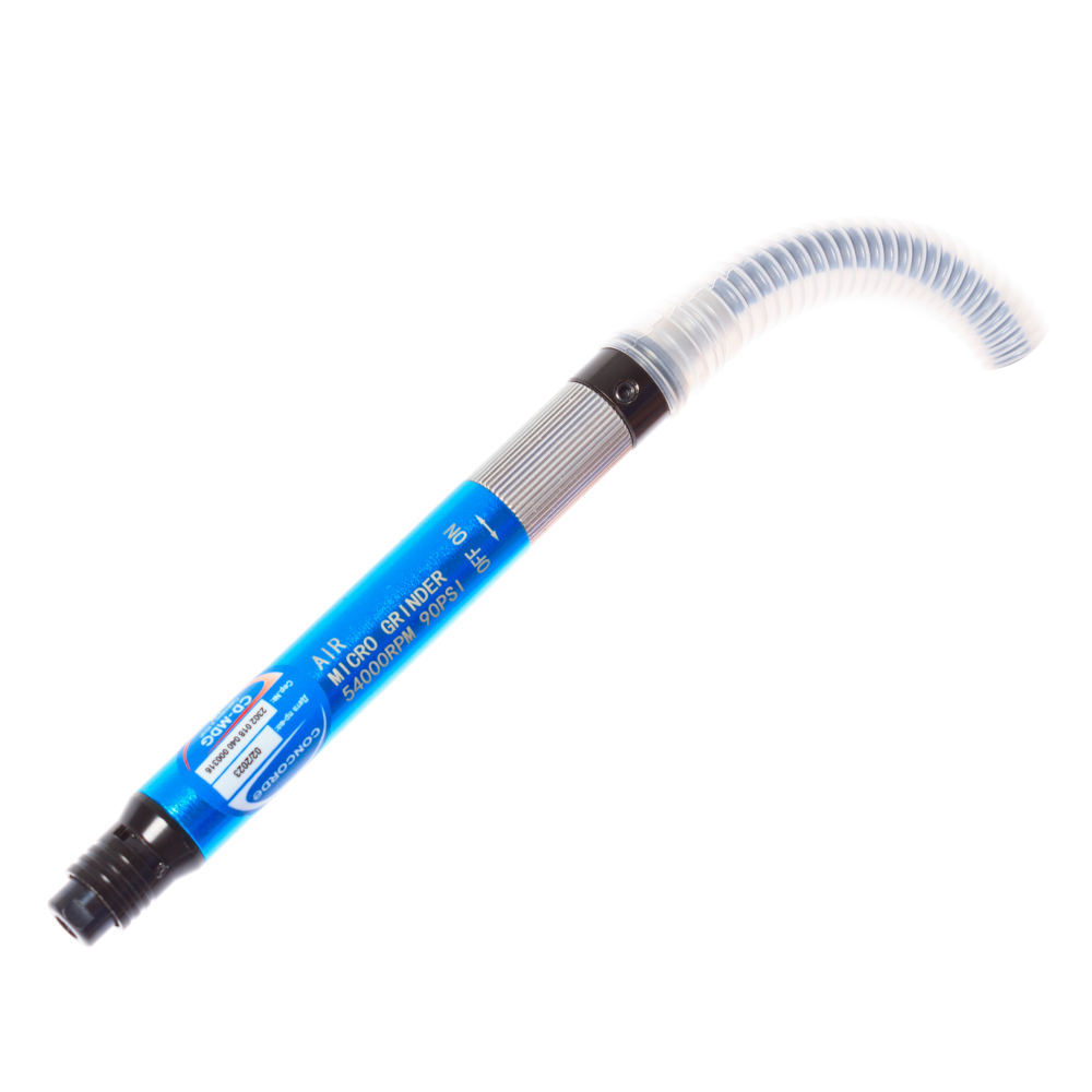 Гравер пневматический Concorde CD-MDG в металлическом корпусе с цанговым зажимным патроном и гибким шлангом. Предназначен для микрообработки изделий из металла, дерева или пластика на высоких оборотах, для снятия облоя и тонкой шлифовки литых изделий; гравировки и прочих деликатных работ. Универсальный инструмент для разных задач. Цанговый зажим позволяет устанавливать абразивные насадки (шарошки) и борфрезы.