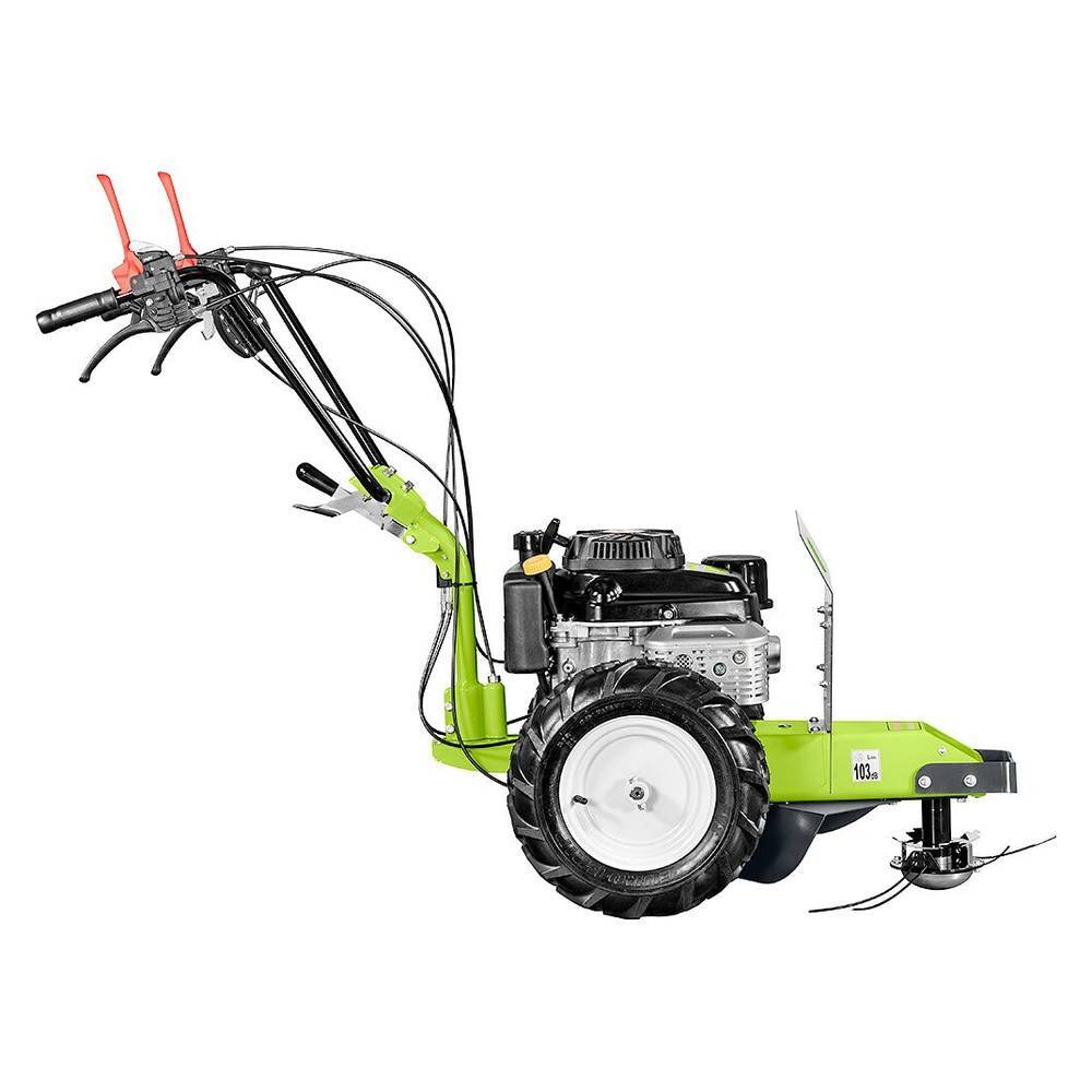 Стояночный тормоз также позволяет остановить машину даже в условиях крутого уклона. А косильный механизма оснащен автоматическим тормозом при отпускании рычага привода триммерной головки.