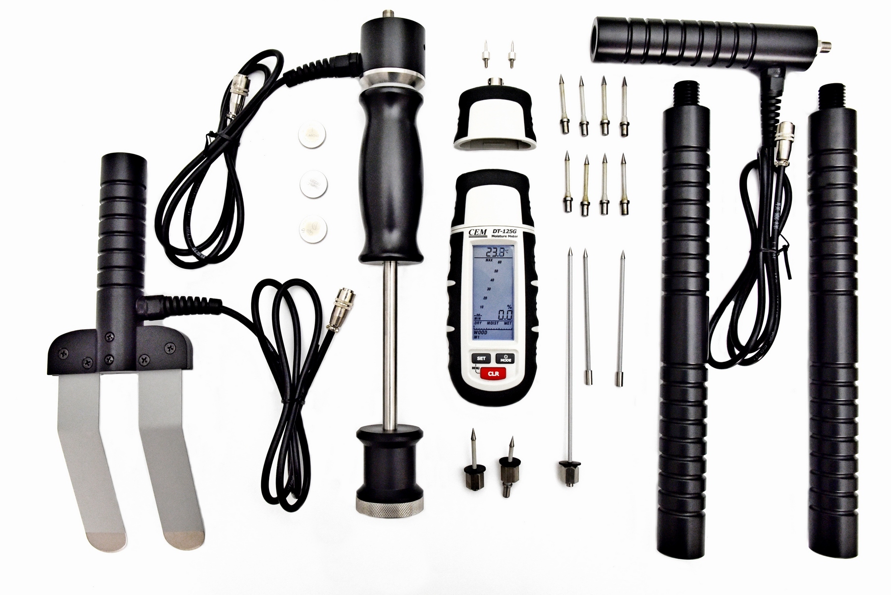 Влагомер DT-125G — измеряет процент влажности в древесине (19 видов) и строительных материалах (121 вид). В комплектации предусмотрены щупы разной формы, поэтому устройство может изучить сыпучее сырье, цементные растворы. Вычислит процент влажности в окружающей среде.